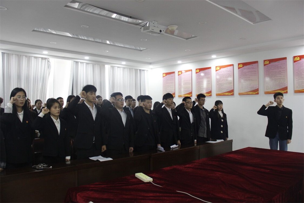 各位预备党员介绍完成后,介绍人李彦老师向支部大会介绍发展对象的情况,表明同意发展其入党的意见,随后汇报了对发展对象的培养教育考察和政审情况。经过参加本次支部党员大会且有表决权的全体正式党员举手表决,一致同意接收这些同志为中共预备党员。在2017级中共党员王祥宇同学的带领下,全体中共预备党员前往党员活动室,面对入党誓词,高举右拳、庄严宣誓,王祥宇同学逐句领誓,预备党员齐声跟读。会议在意气风发的宣誓声中落下帷幕。