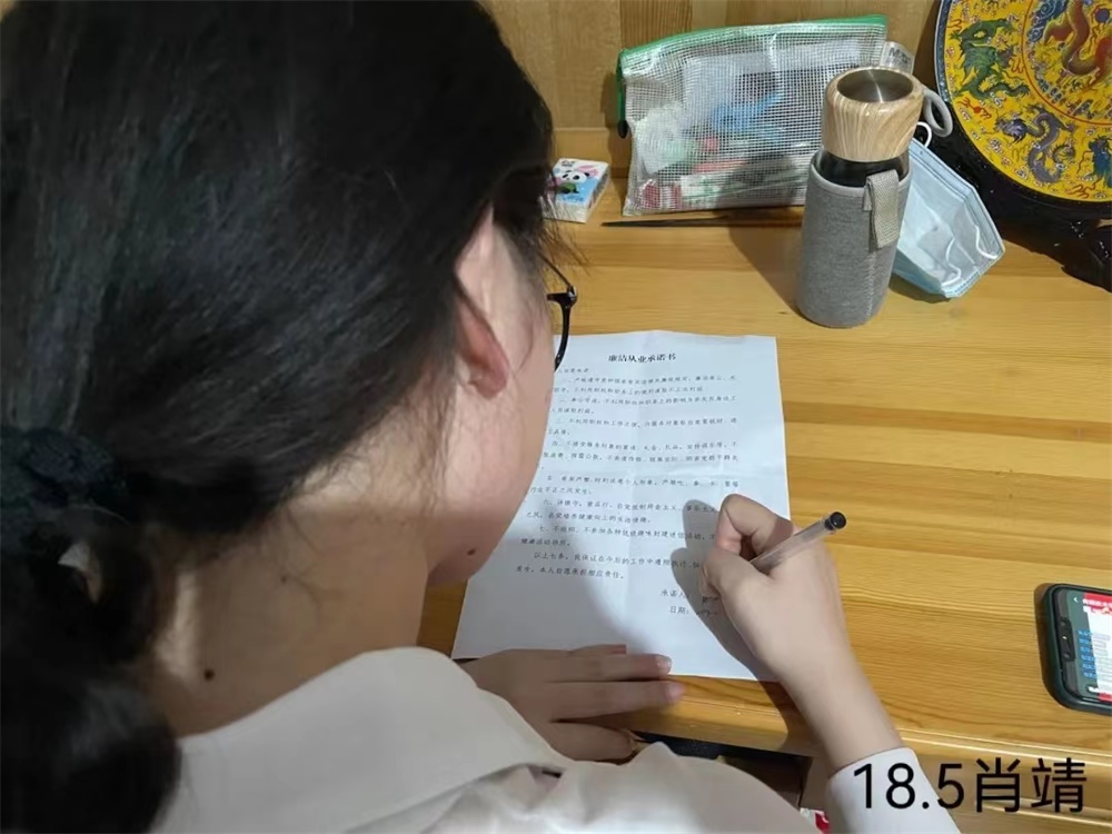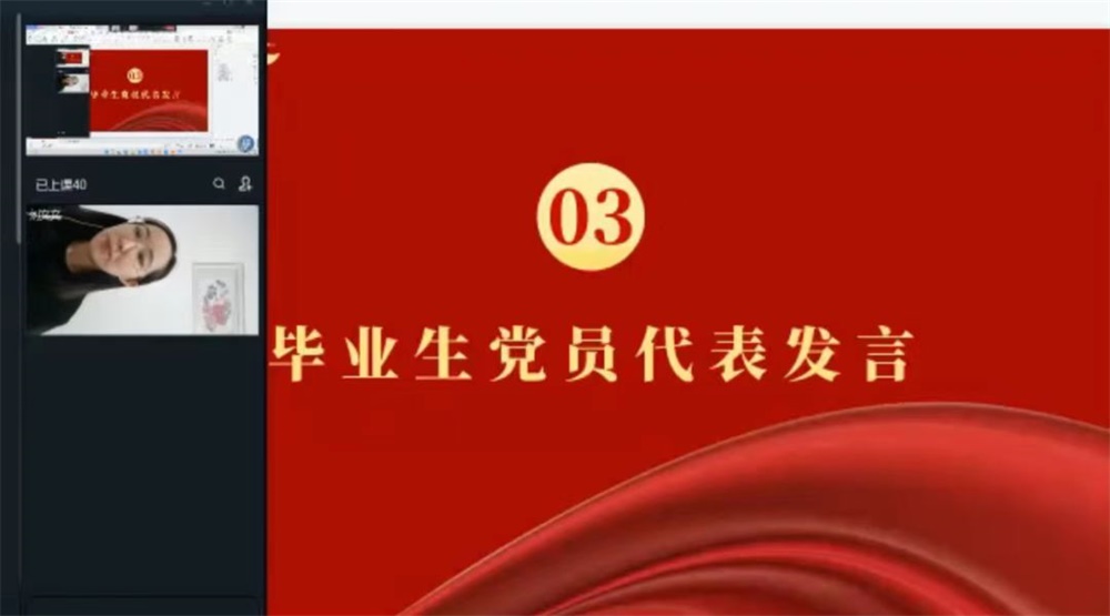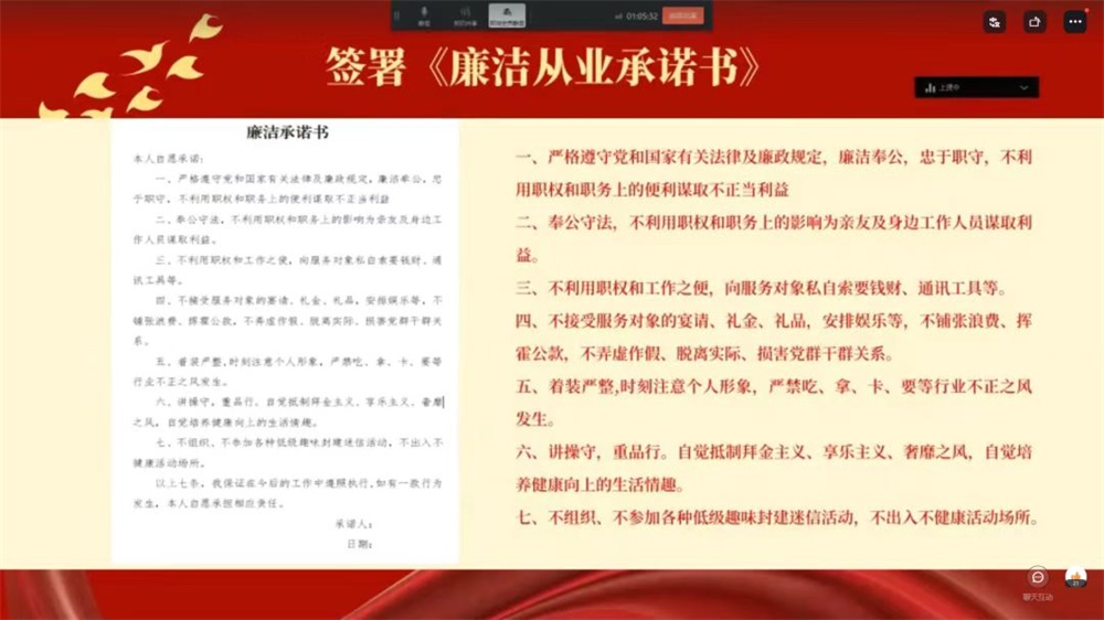 视频观看结束后,毕业生党员代表刘文文就廉洁从业主题进行了发言,她提出党员毕业生站在当下社会中,要时刻保持清醒的头脑,面对物欲横流的社会,毕业生党员更加需要走好人生的转折点,把握好自己人生的航标。随后毕业生党员都于线上签署了《廉洁从业承诺书》,重温了入党誓词。