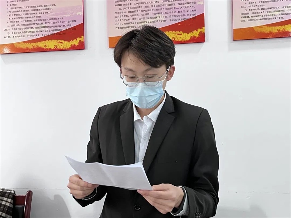 会议伊始,由预备党员王涵、周书红、孟令强依次宣读转正申请。汇报自己在预备期间的思想认识,表明转正的态度。他们承诺从日常小事出发,端正学习态度,掌握更多本领,增强服务意识。坚决拥护党的路线、方针和政策、遵守党的章程、履行党员义务,对党忠诚,实践为共产主义奋斗终身的誓言。