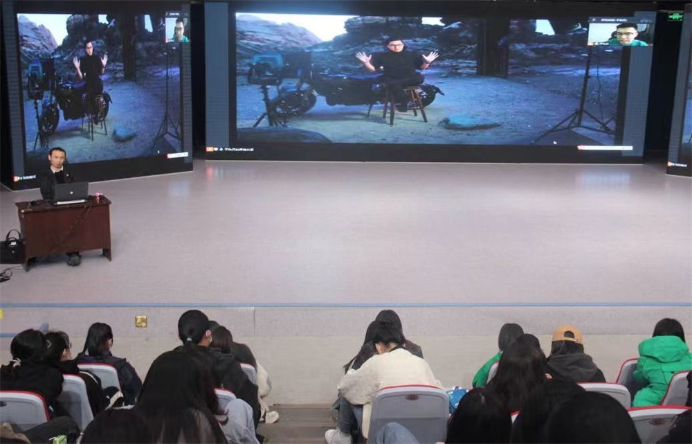 专业成就卓越,技能成就未来。活动伊始,孙振通过PPT结合图片及企业宣传片等视频向同学们简要介绍了企业的基本情况,让同学们对企业的发展状况、产教融合实习基地的现状有了大致了解。随后,由于秋贝开展关于虚拟制片的主题教学,他通过PPT向同学们讲解了虚拟制片的定义、发展及工作流程,传统拍摄与虚拟拍摄的区别,然后分别从虚拟拍摄的定义、流程、组成等角度向同学们展示这一新生技术的发展前景。他提到相对于传统拍摄,虚拟拍摄更便捷灵活、稳定可靠。