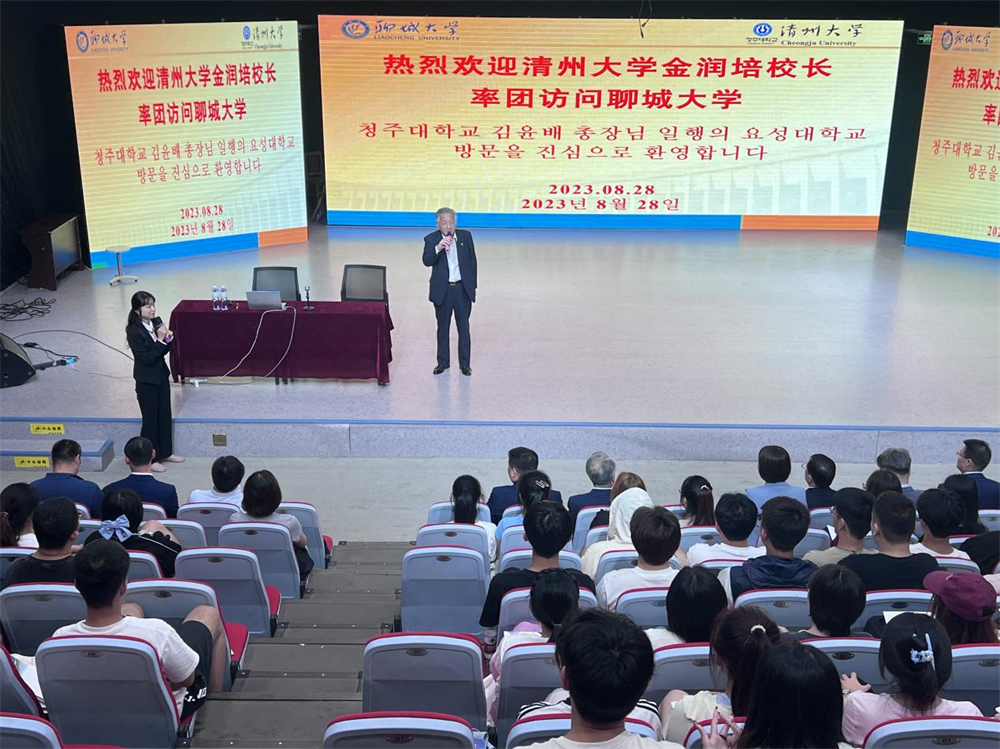 8月28日下午,韩国清州大学校长金润培、荣誉教授金荣哉、国际处处长权赫宰和国际处合作办学负责人朴秀贞一行来到西校区综合实验楼演播厅参加中韩合作办学专业师生交流见面会活动。陪同参加活动的还有我校党委常委、副书记房增福,国际处副处长钱润池,我院党委副书记、院长郭峰,副院长秦建波,影视编导与技术系主任郭玉真等领导老师,太阳tyc集团5997广播电视编导中外合作办学专业全体在校生参与了此次活动。