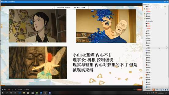 学生分享环节是线上授课以来较大的惊喜所在。学生们采用屏幕分享直播或者课下录屏的方式分享自己的观影心得,其余同学与老师则同时加以讨论。由于这些学生对相应软件使用的都相当熟练,对于不需要实际面对面的网络沟通环境也更为适应,使得很多本来不太善于沟通交流的同学放开了很多,更乐于展示自己。这使得讨论分享环节的课堂气氛比现实中教室里的时候活跃得多。在后续的授课中,应该有意识的利用这一点提高讨论课程的授课质量。
