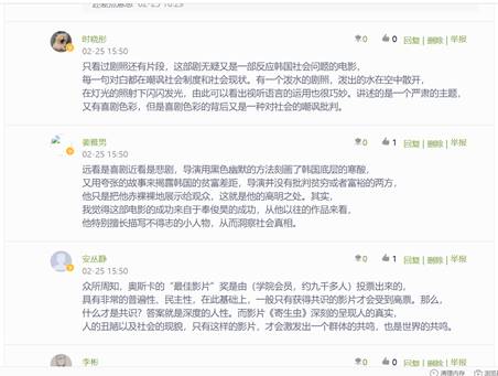 讨论:每一次上课都会有讨论话题,比如,在进行绪论最后一节影视拓展知识的讲授中,结合最新一届奥斯卡颁奖典礼,让同学们讨论了关于韩国影片《寄生虫》包揽四项奖项一事的看法。大家畅所欲言,积极表明自己的态度和想法,线上课堂效果热烈,达到了很好的教学效果。