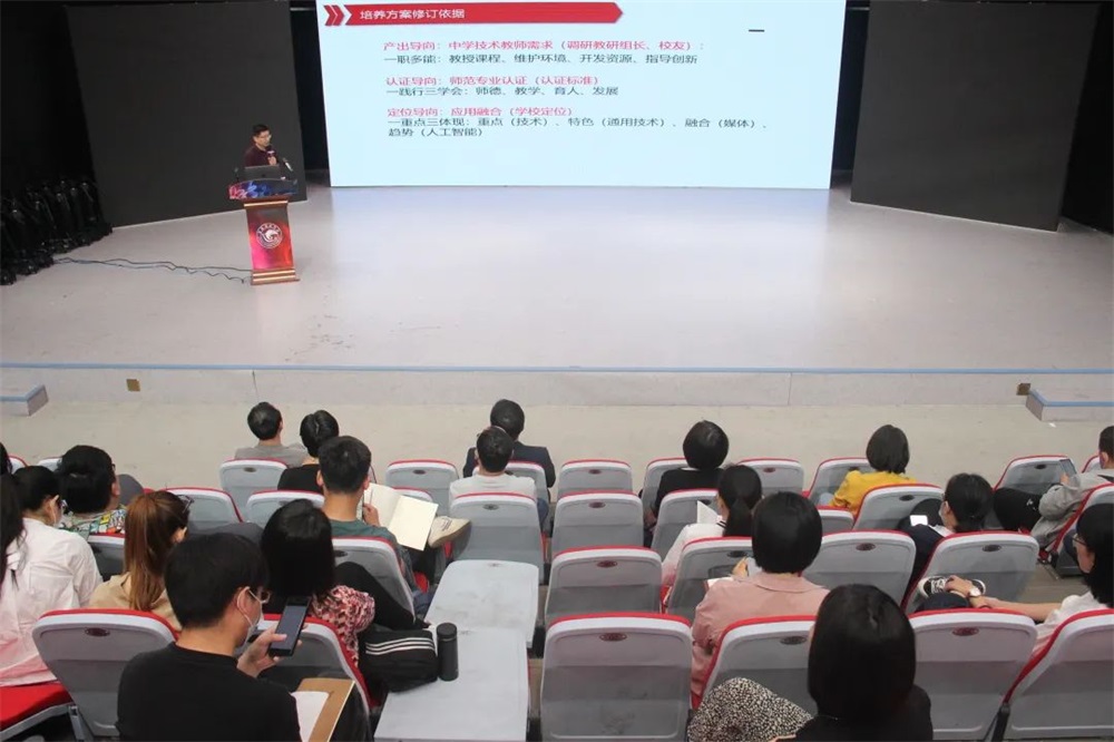 教育技术学专业负责人赵厚福从人才培养谈起,他介绍了教育技术学专业未来的主要培养目标,并依据课程体系要求详细说明了岗位需求、课程设置、课程变化以及设置考虑等内容。