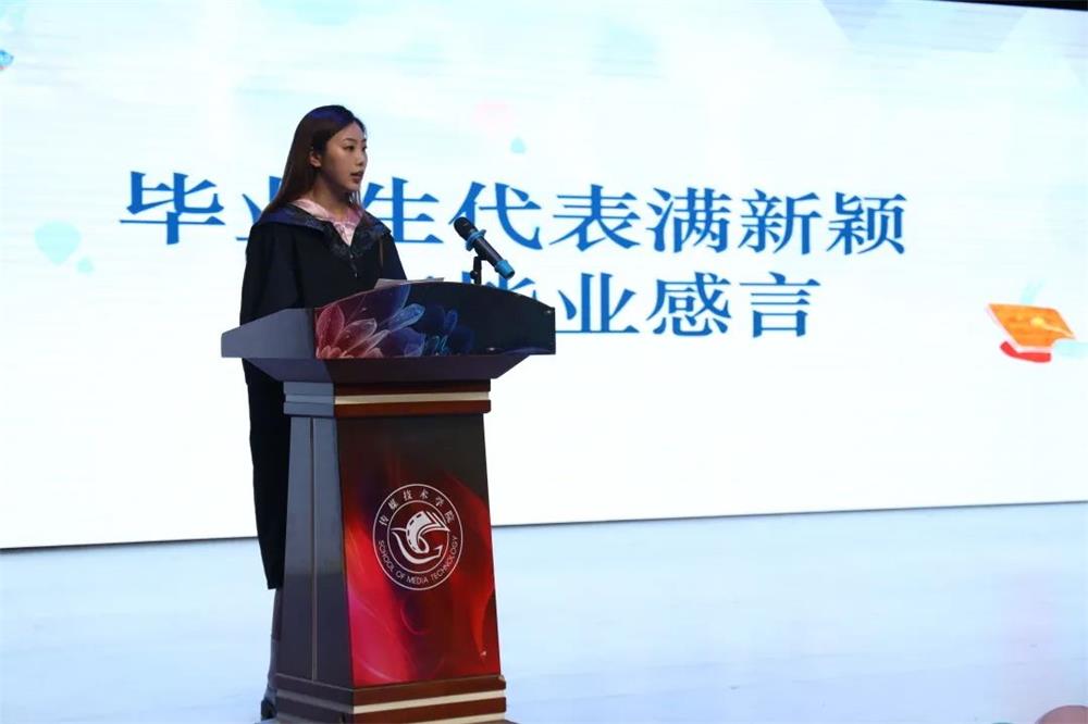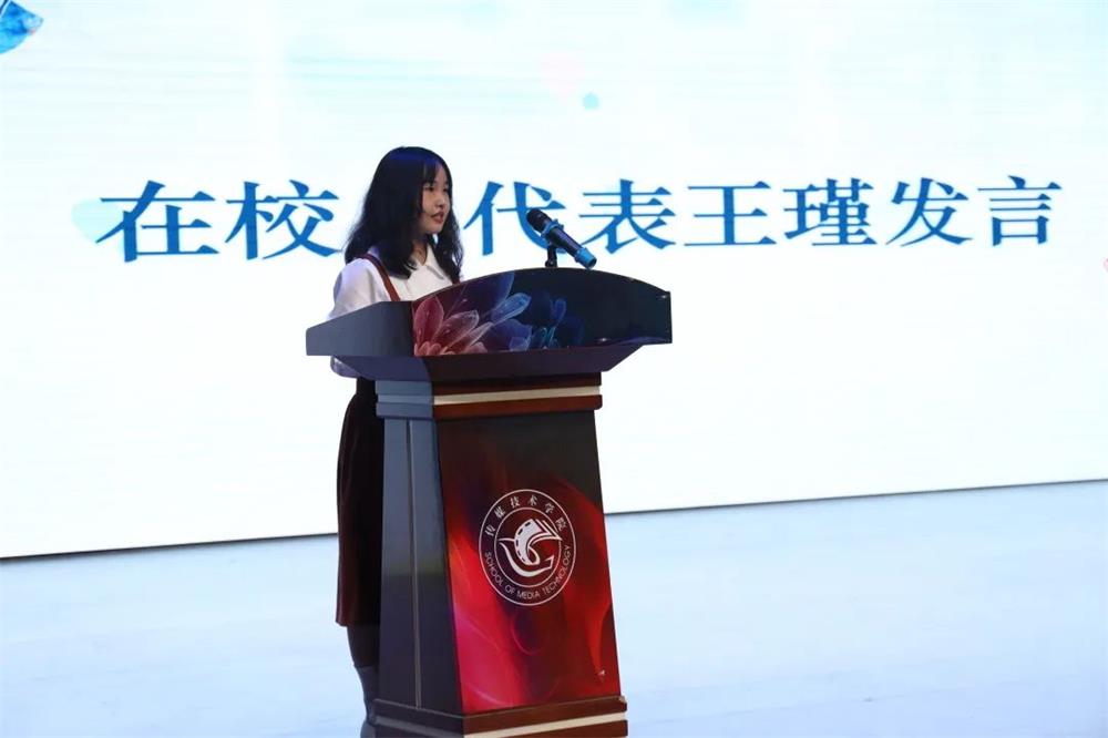 王瑾代表全体在校生祝福各位毕业生学业有所成、事业有所向,并表示身为在校学子,在未来的日子里将学会做事、学会做人,继续续写传媒崭新的篇章