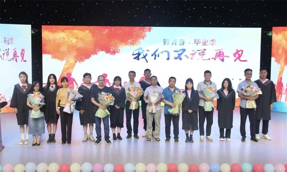 师生祝福视频播放完毕后,八位毕业生代表向老师们献花并合影留念。