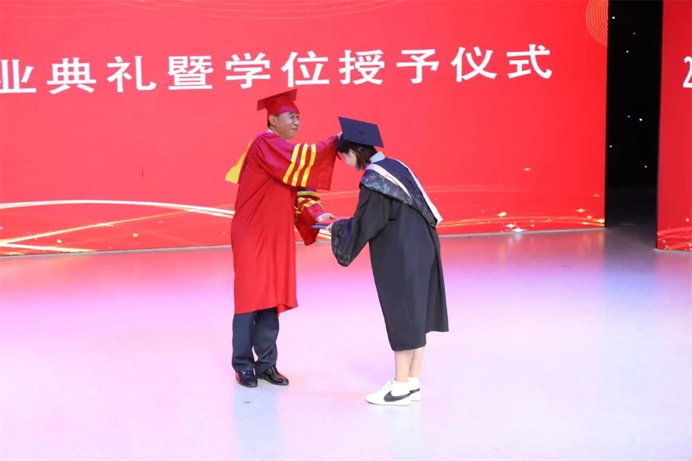 在主持人饱含深情的朗读下,学位授予仪式正式开始。由赵明吉校长、郭峰院长为毕业生进行拨穗及学位证书颁发,毕业生代表依次有序的上台领取并合影留念。