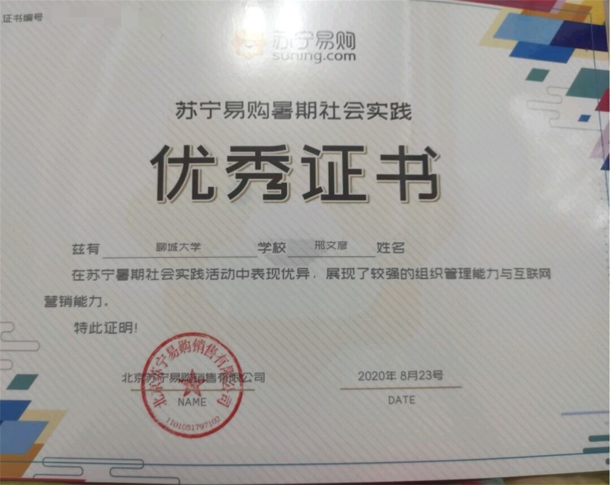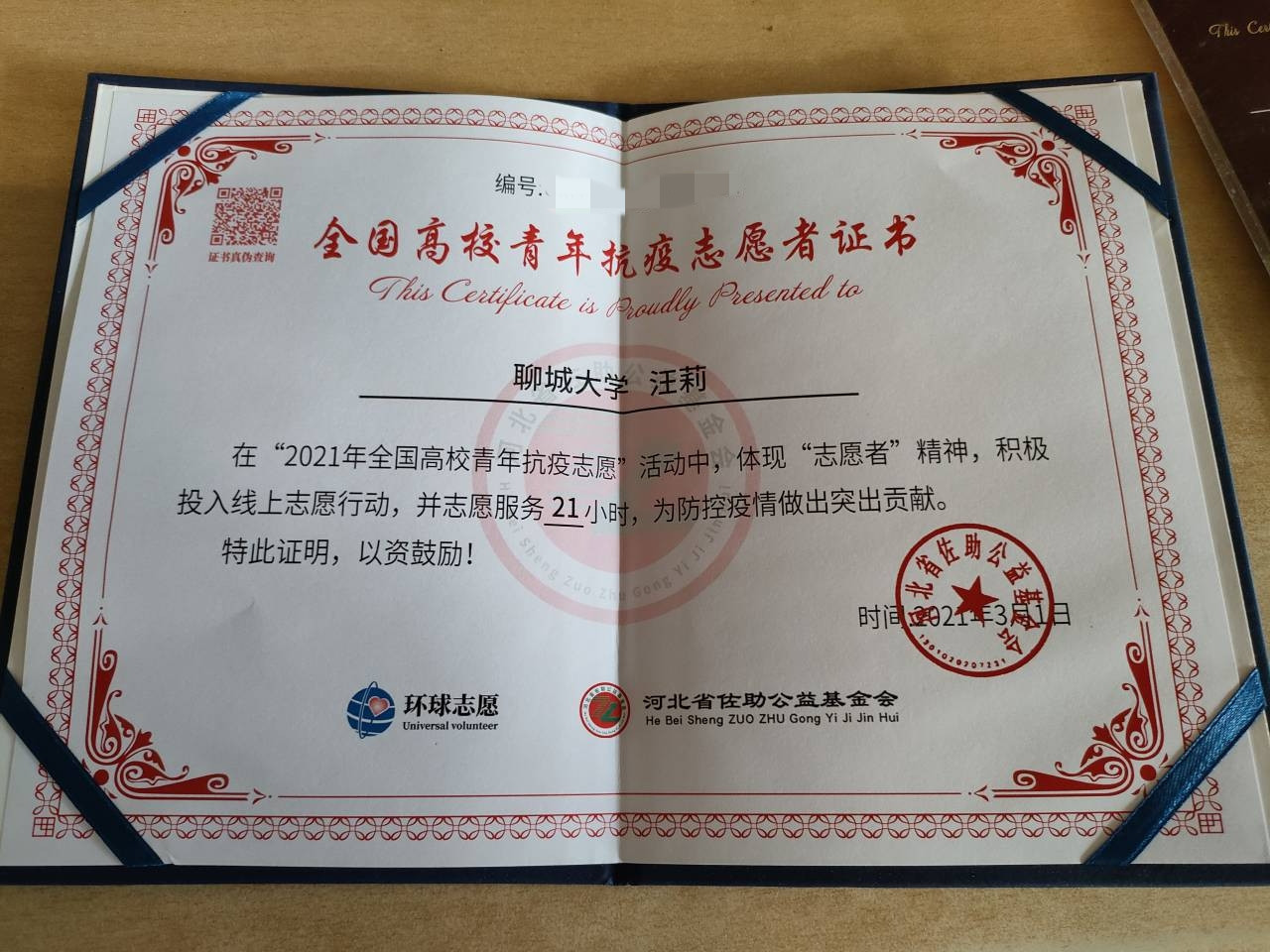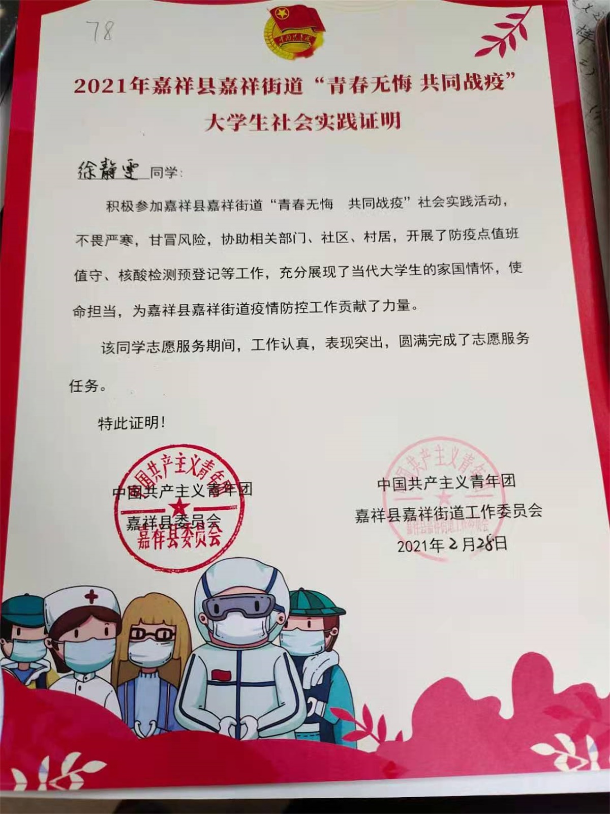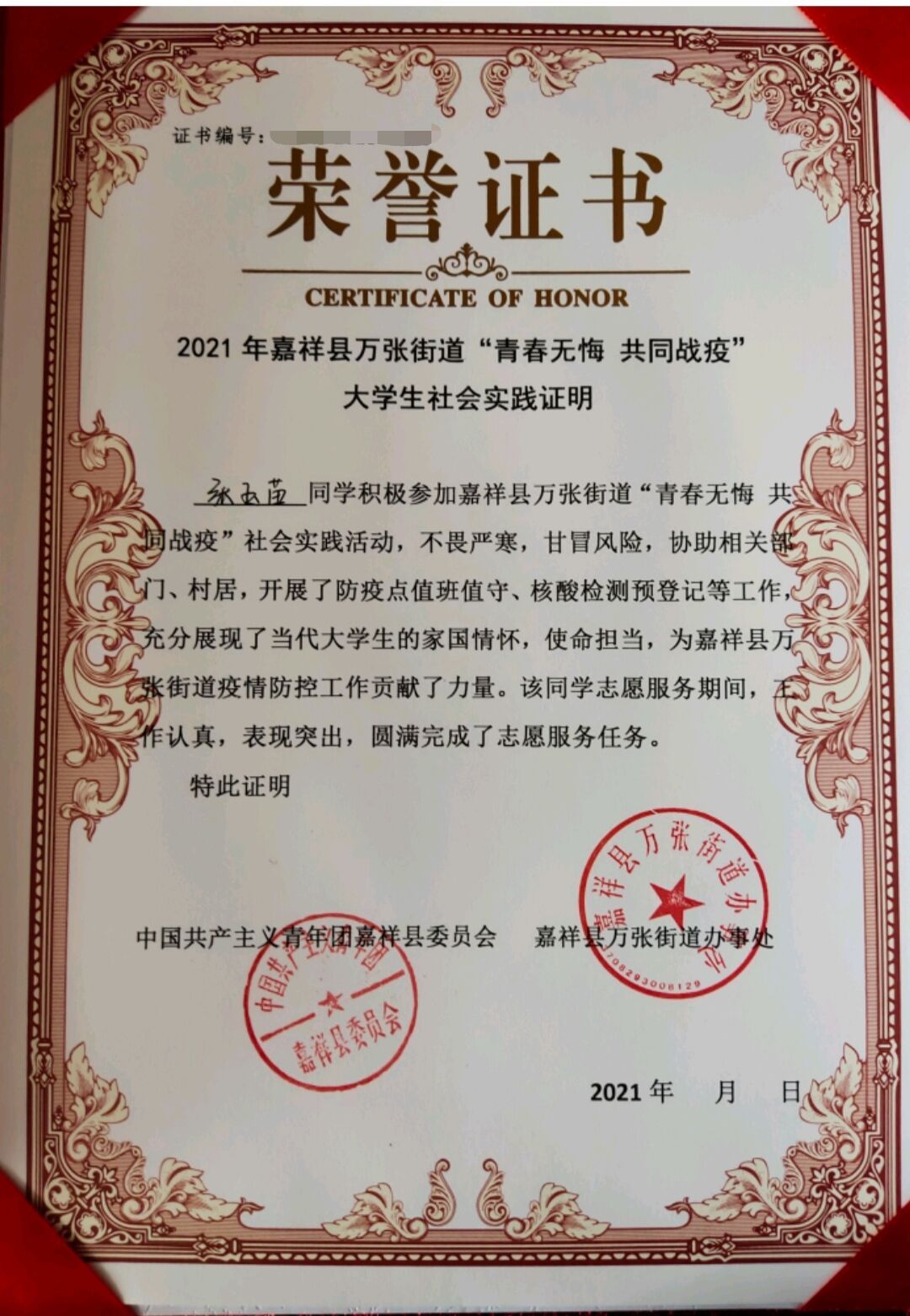 张玉苗获得2021嘉祥县万张街道“青春无悔 共同战疫”大学生社会实践证明