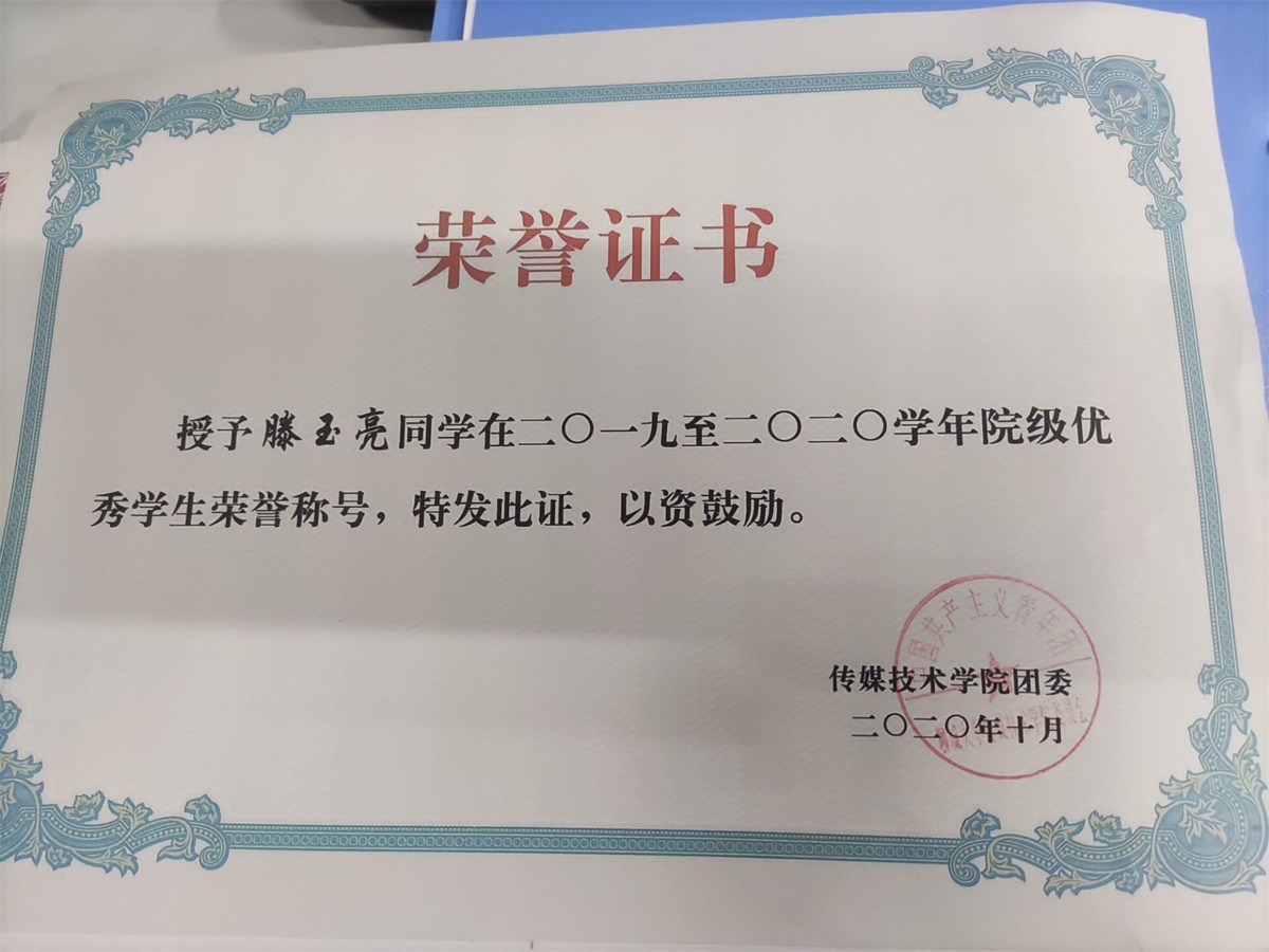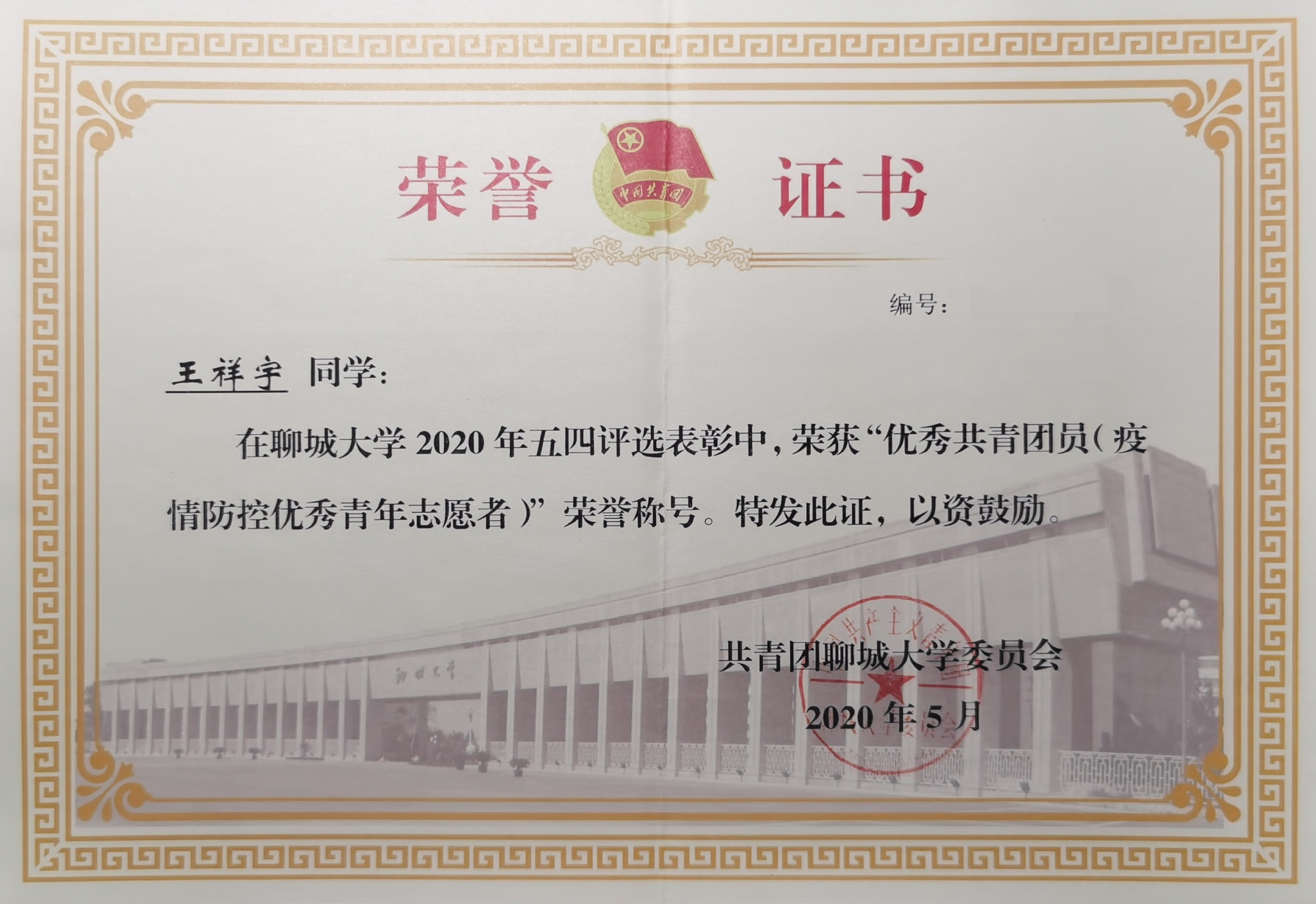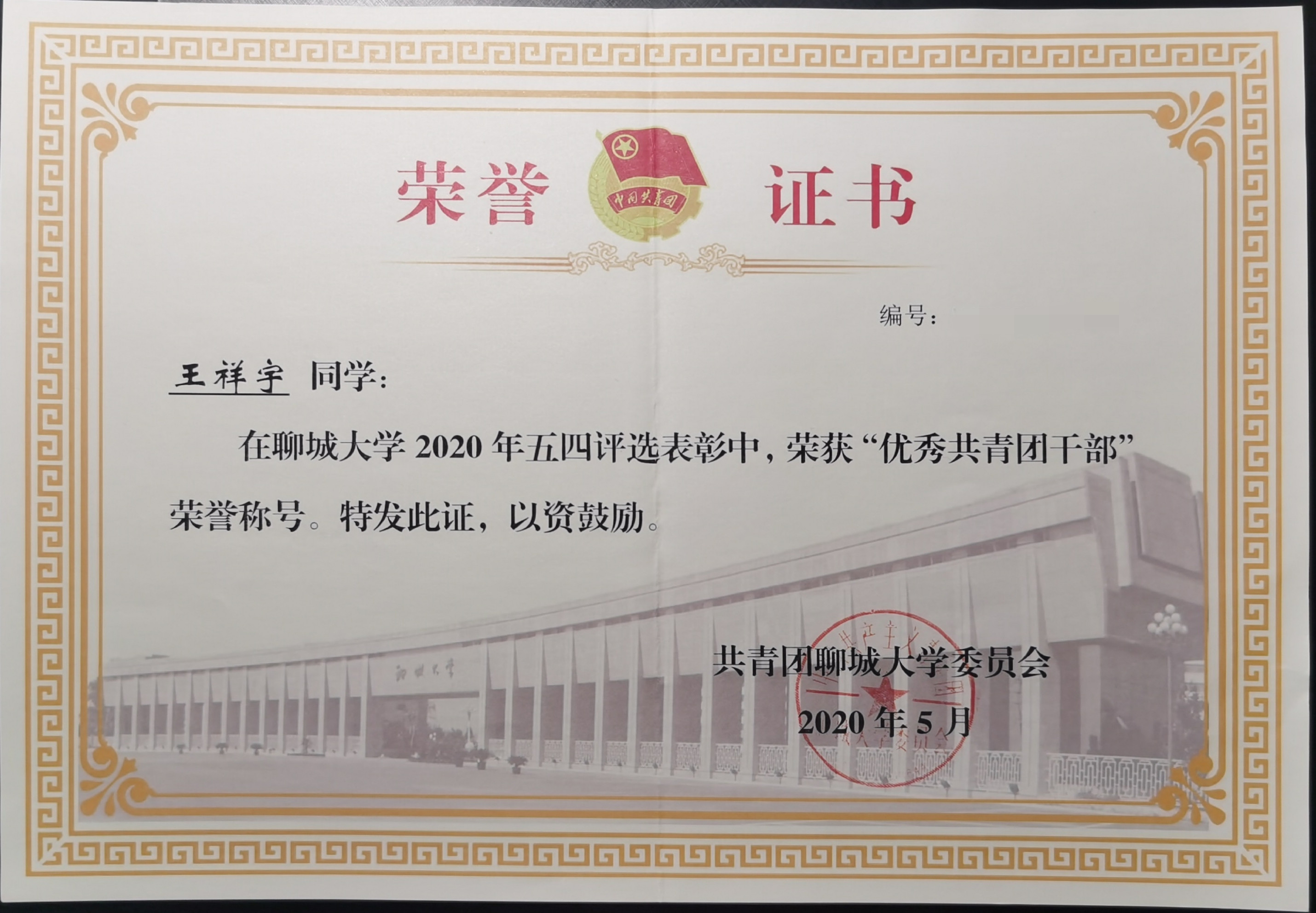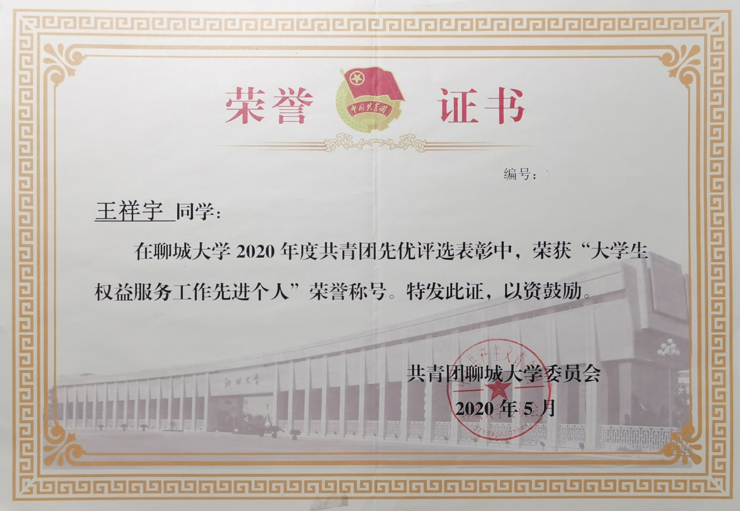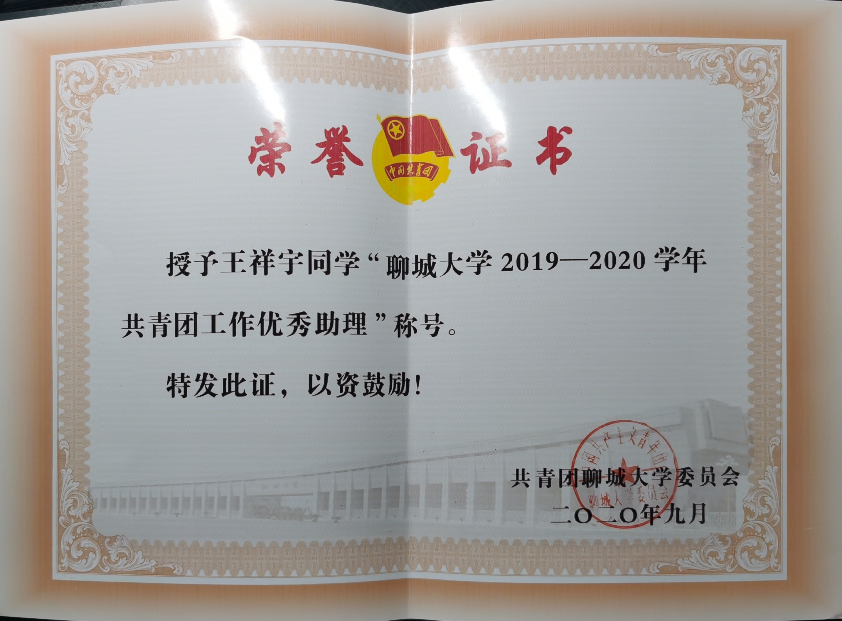 王祥宇,“太阳集团2019——2020学年共青团优秀助理”