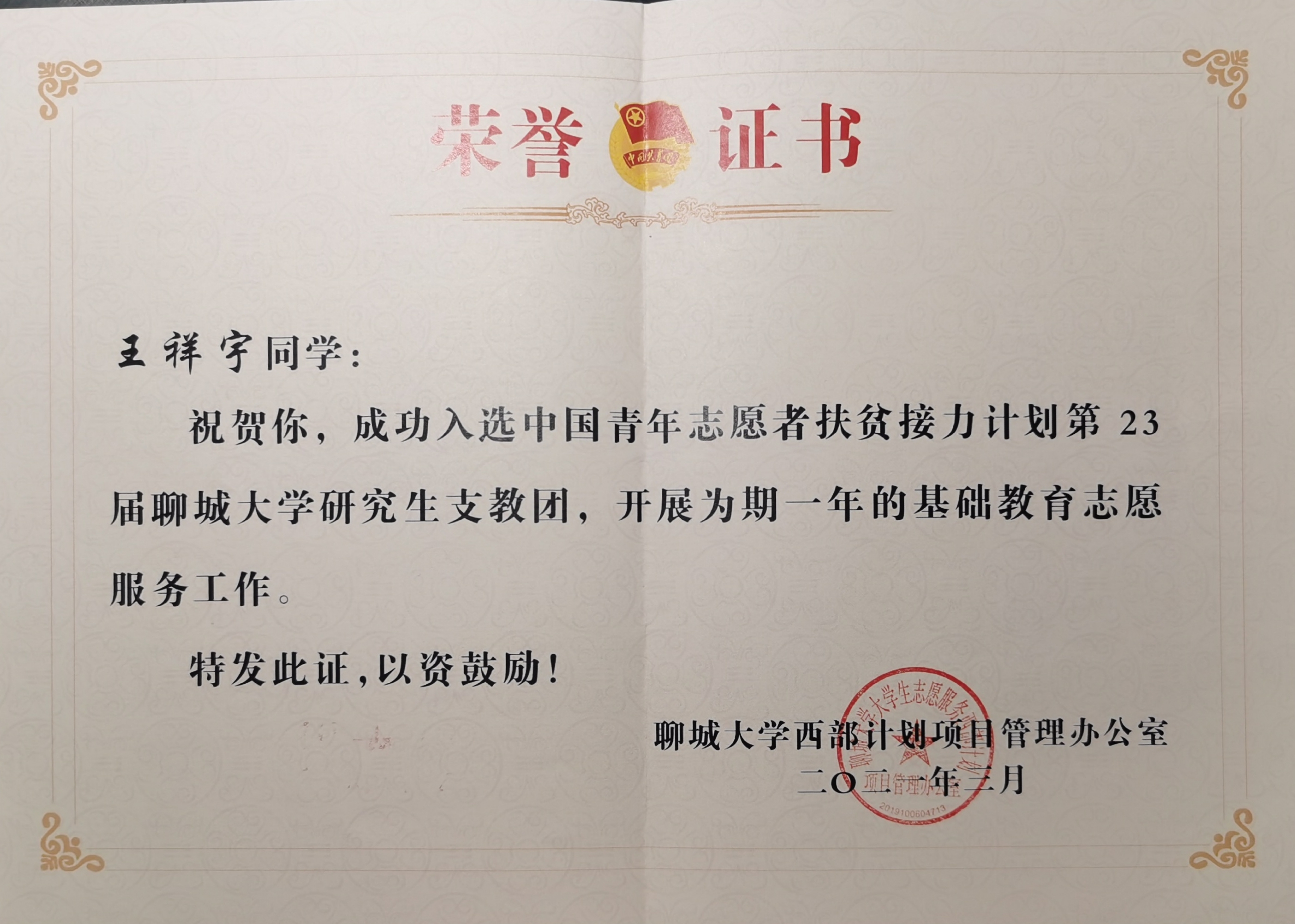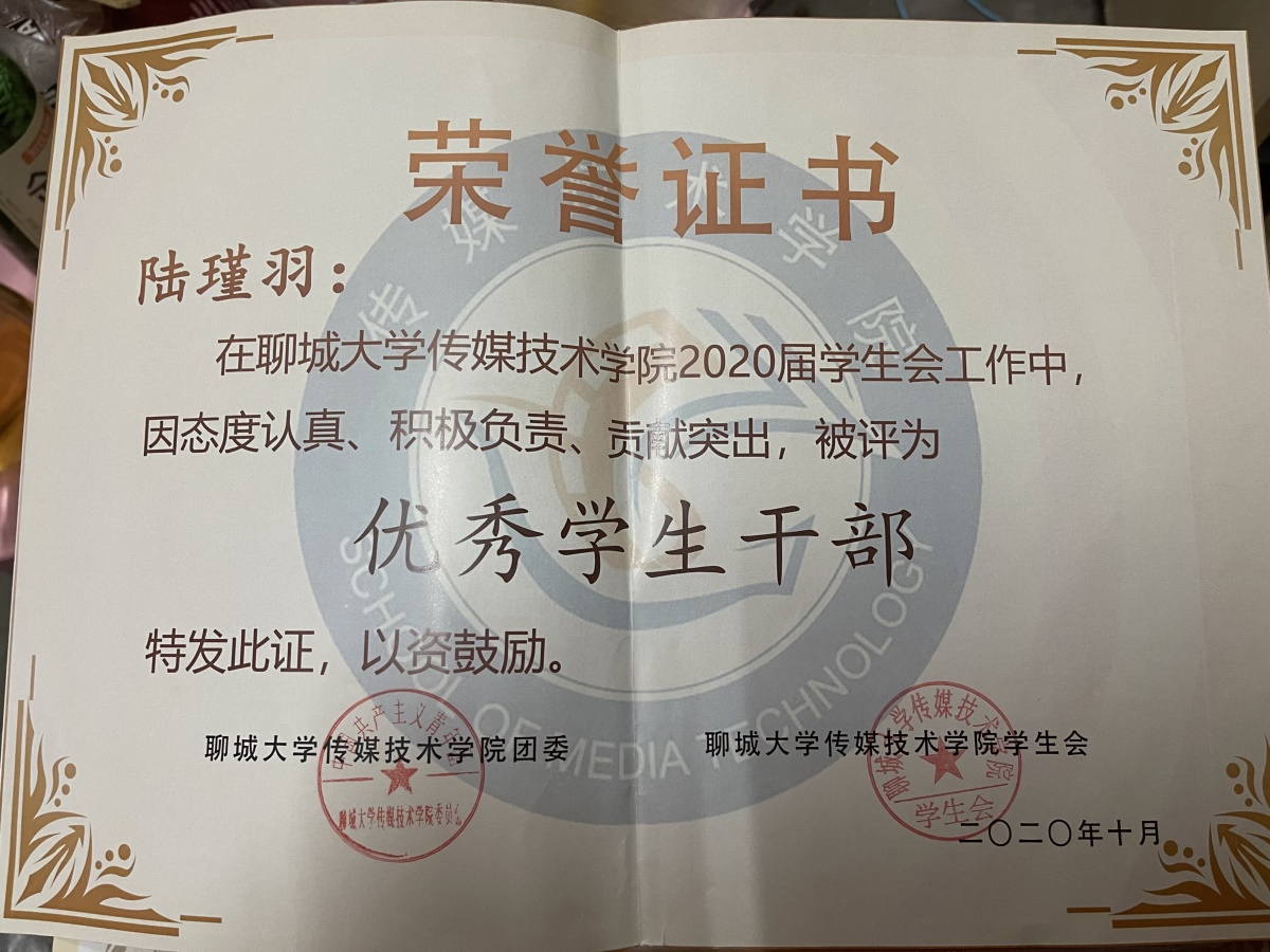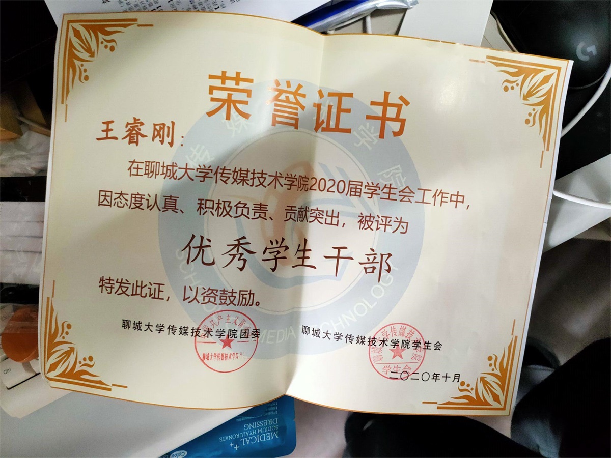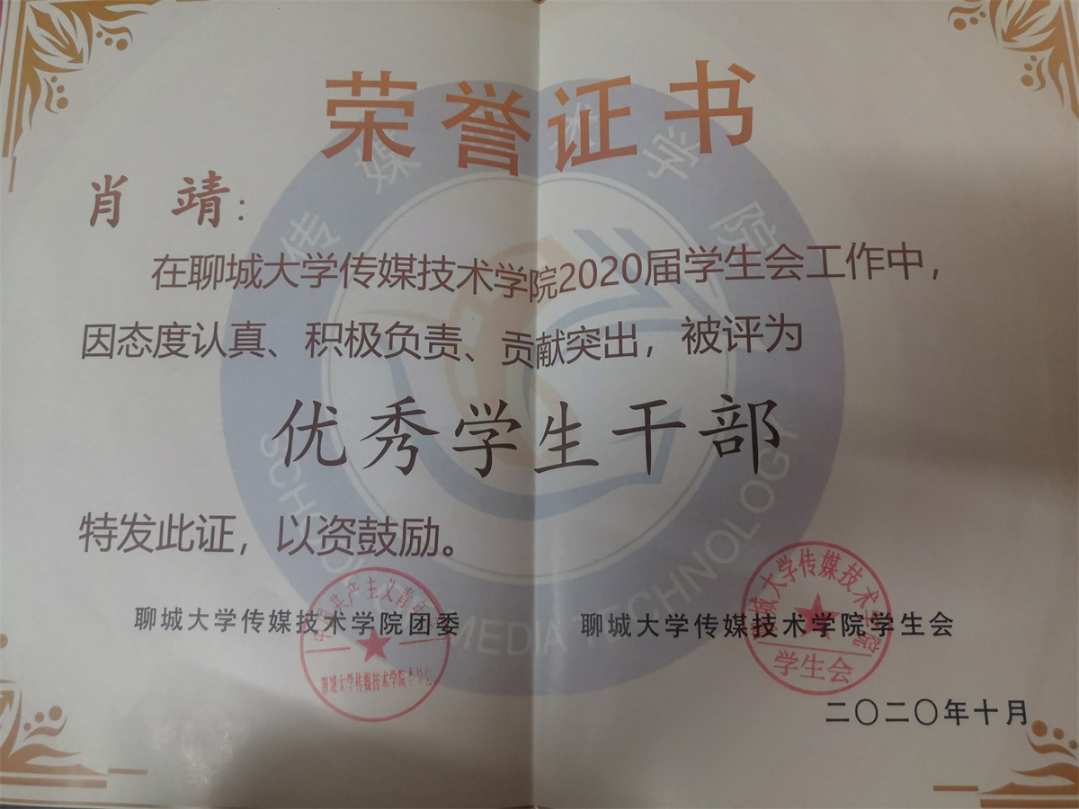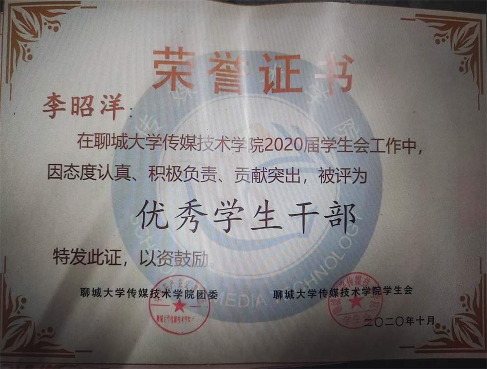 王祥宇,“太阳集团2019——2020学年共青团优秀助理”