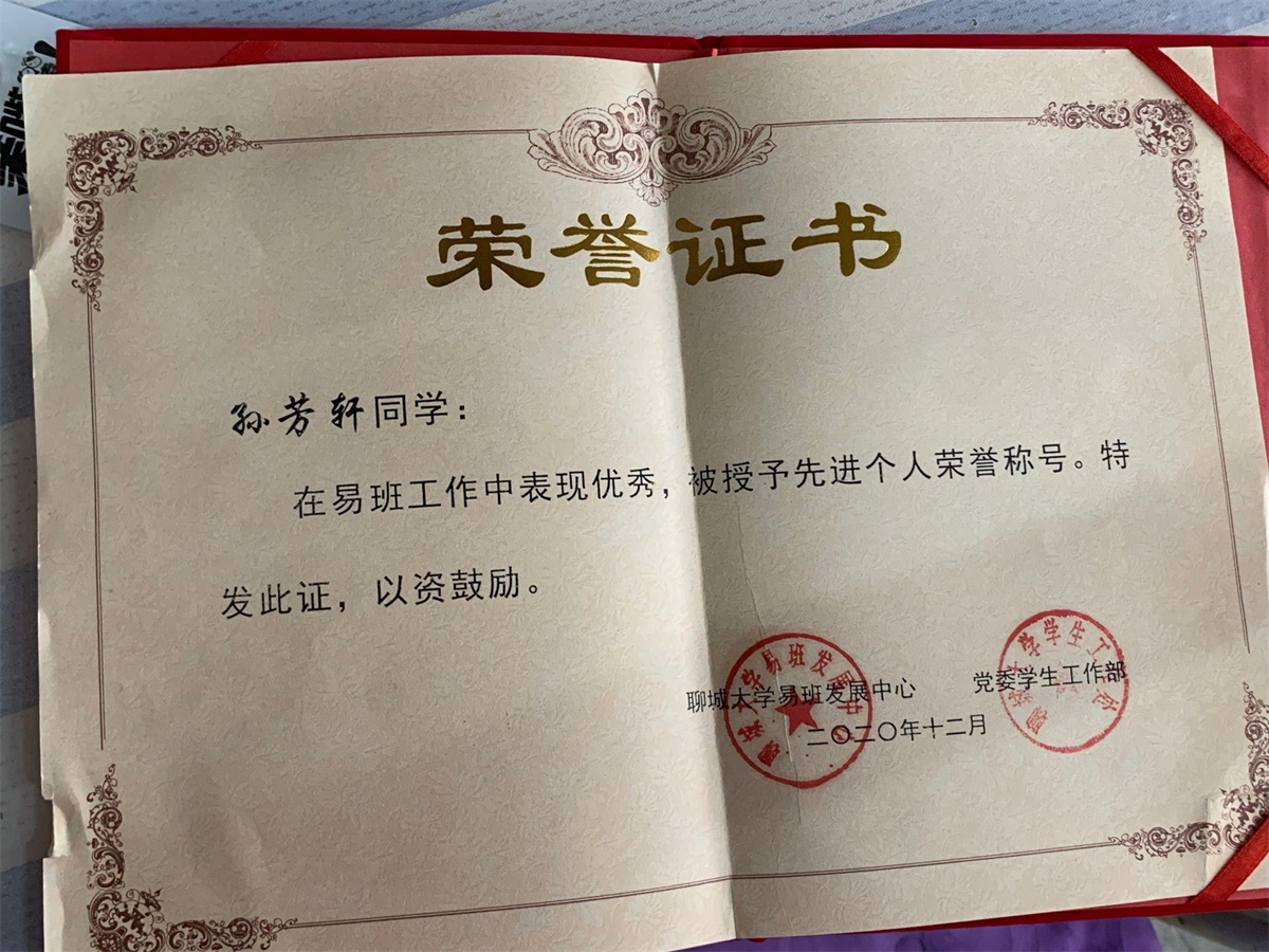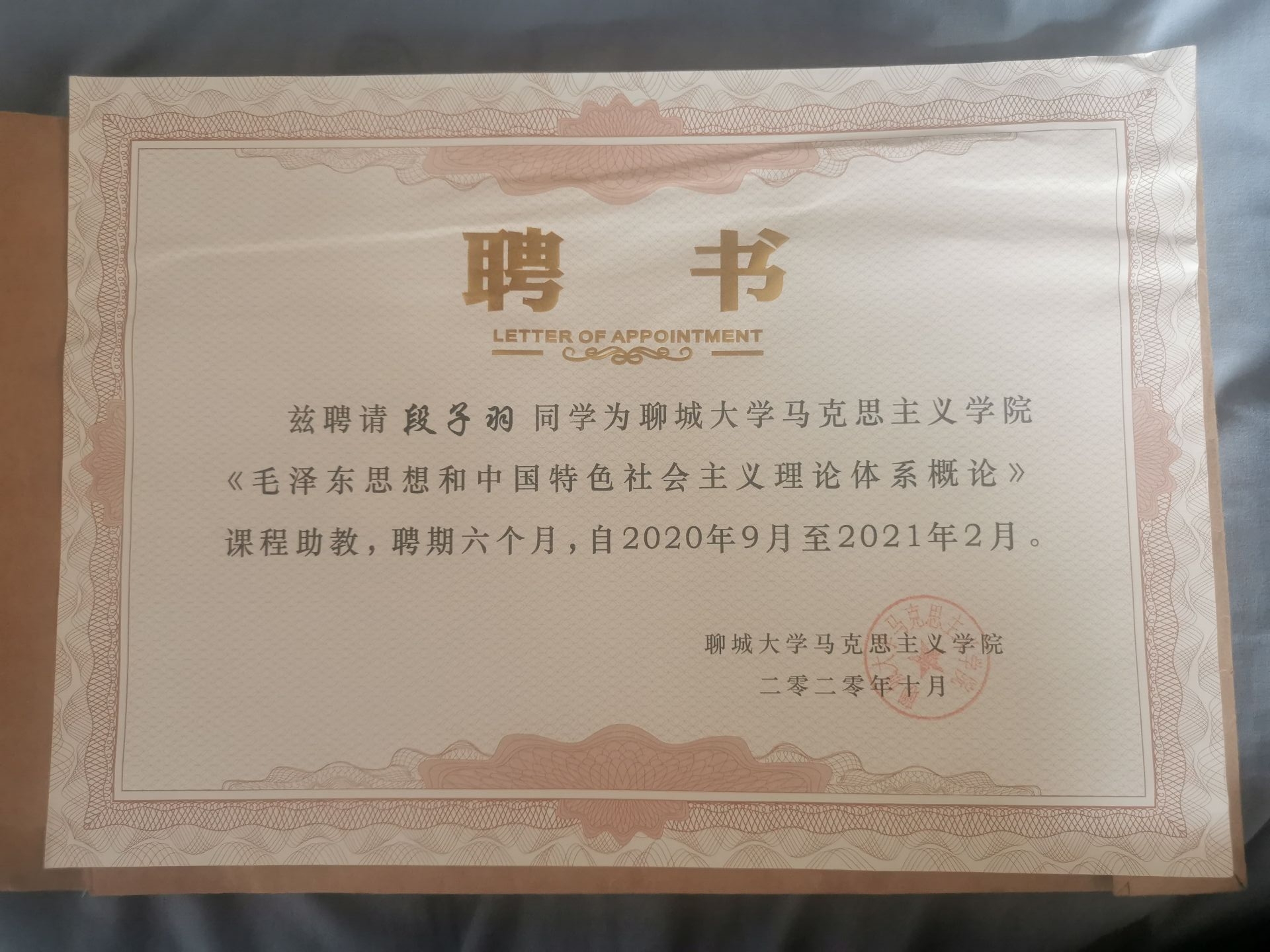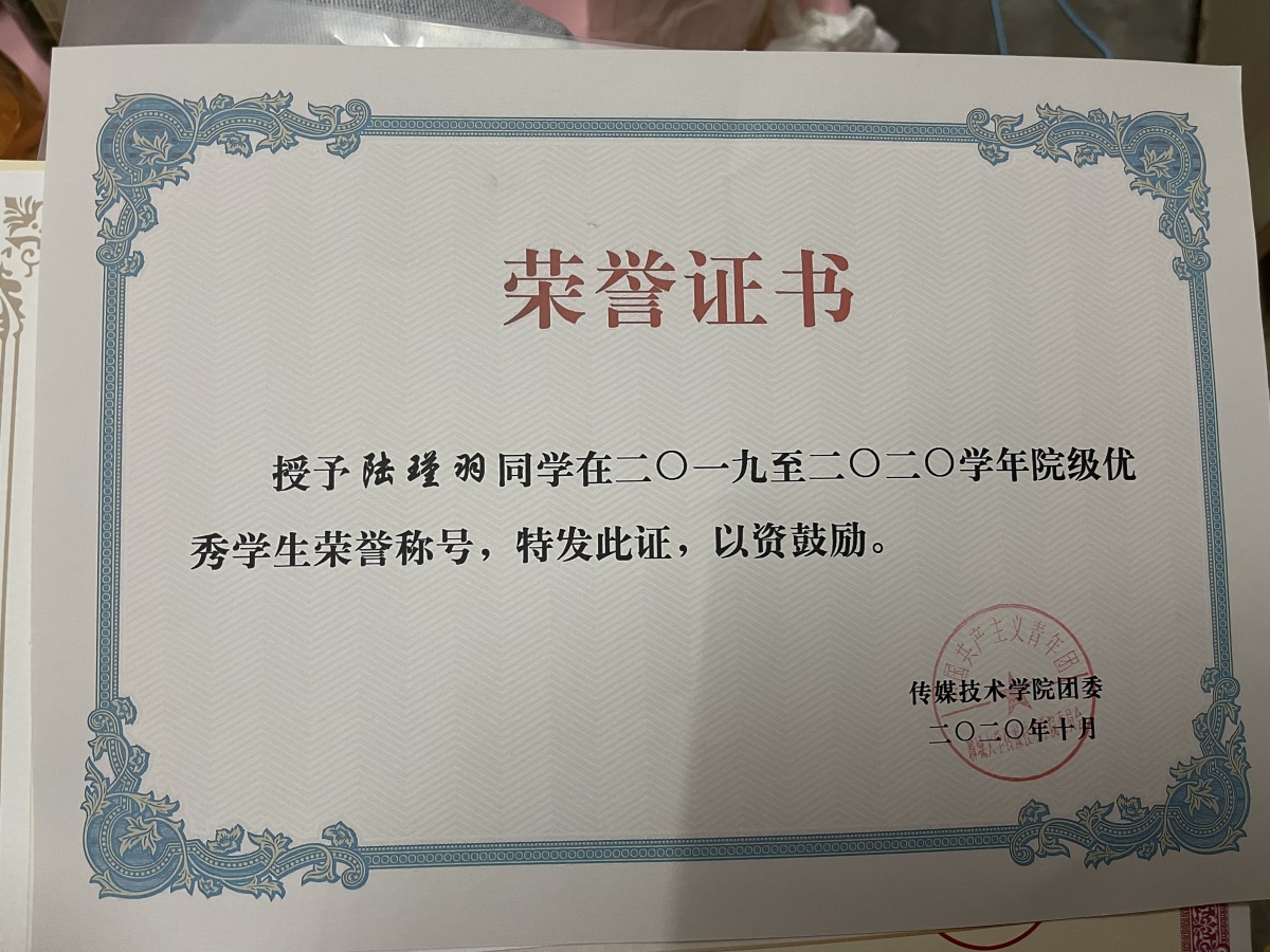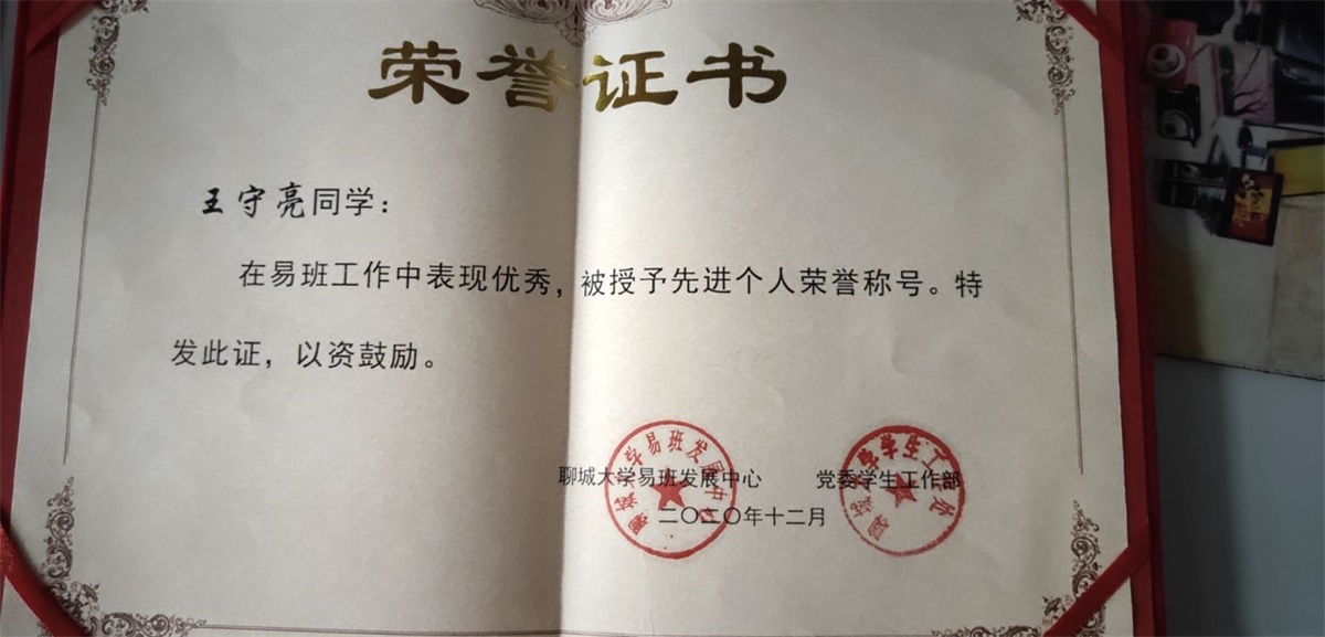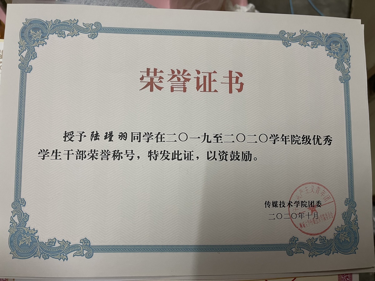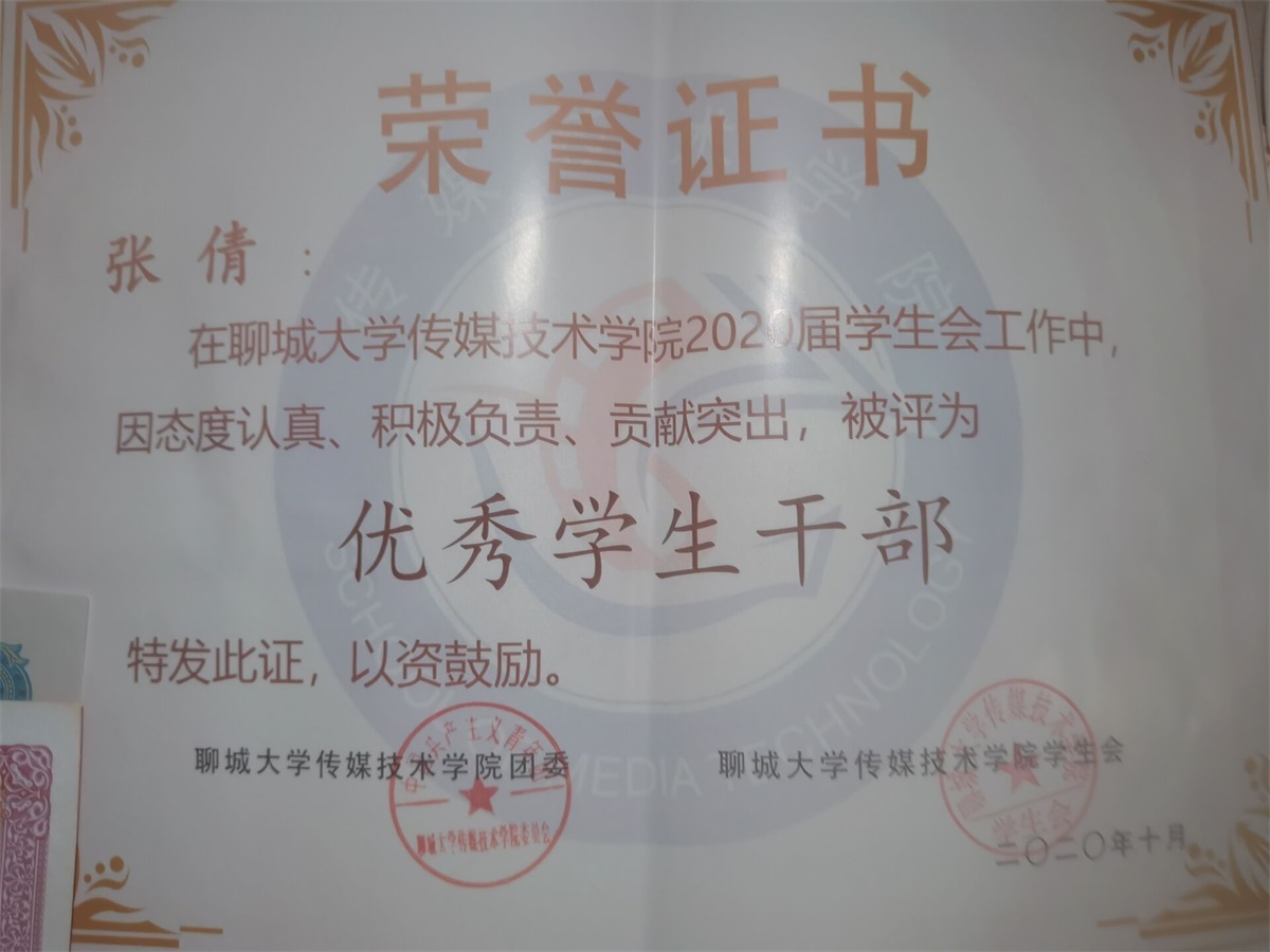 王祥宇,“太阳集团2019——2020学年共青团优秀助理”