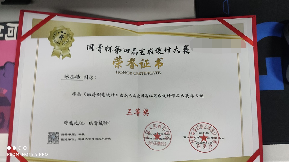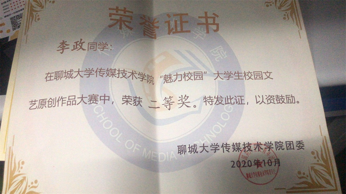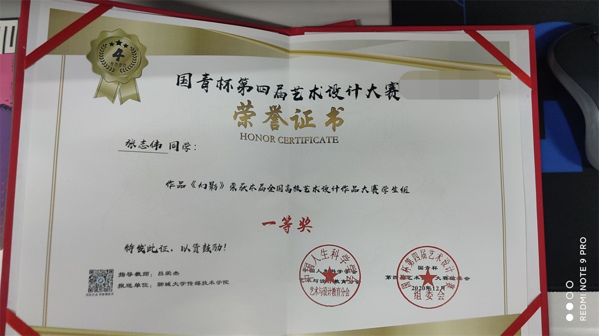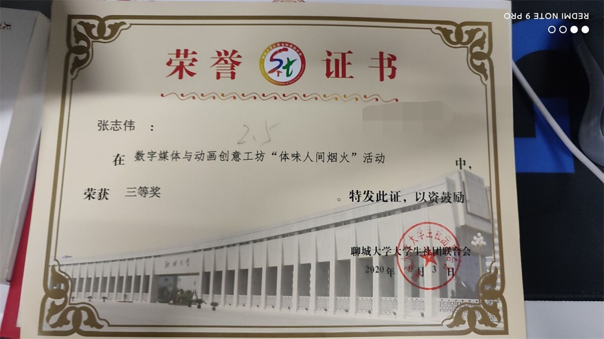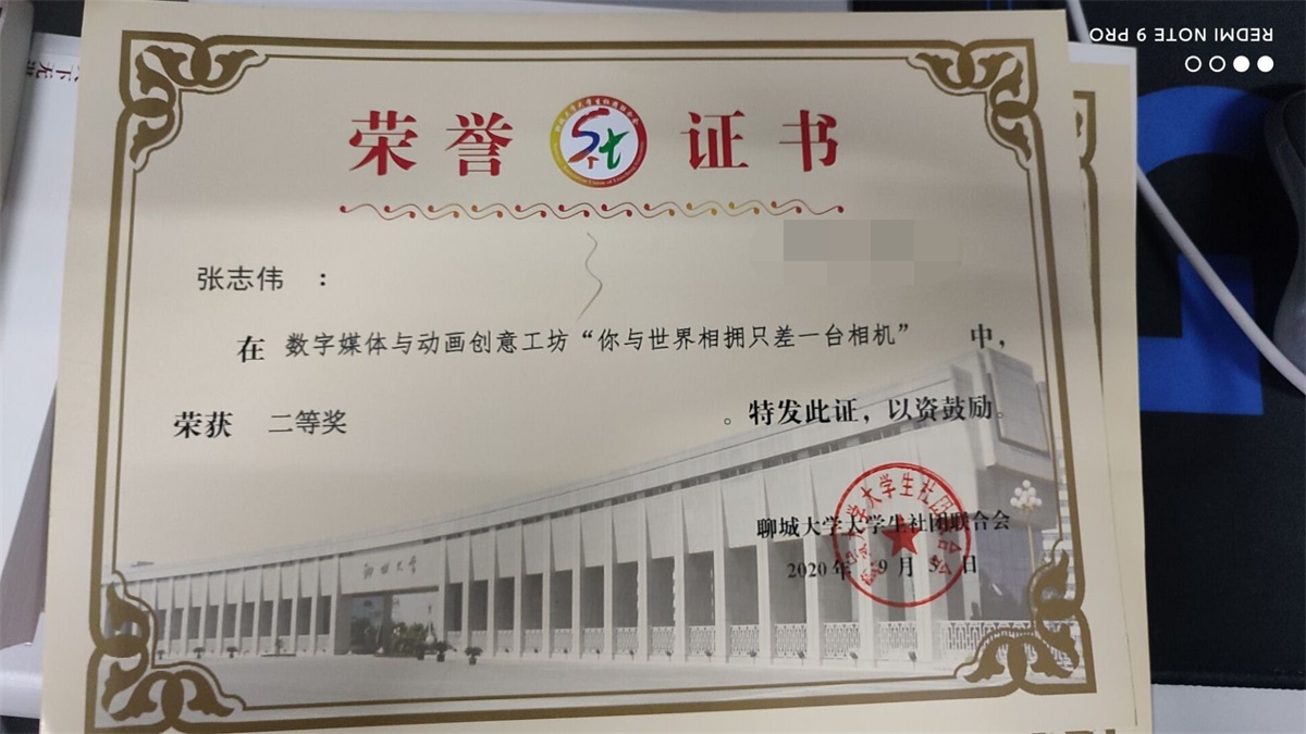 张志伟在数字媒体与动画创意工坊“你与世界相拥只差一台相机”中获得二等奖