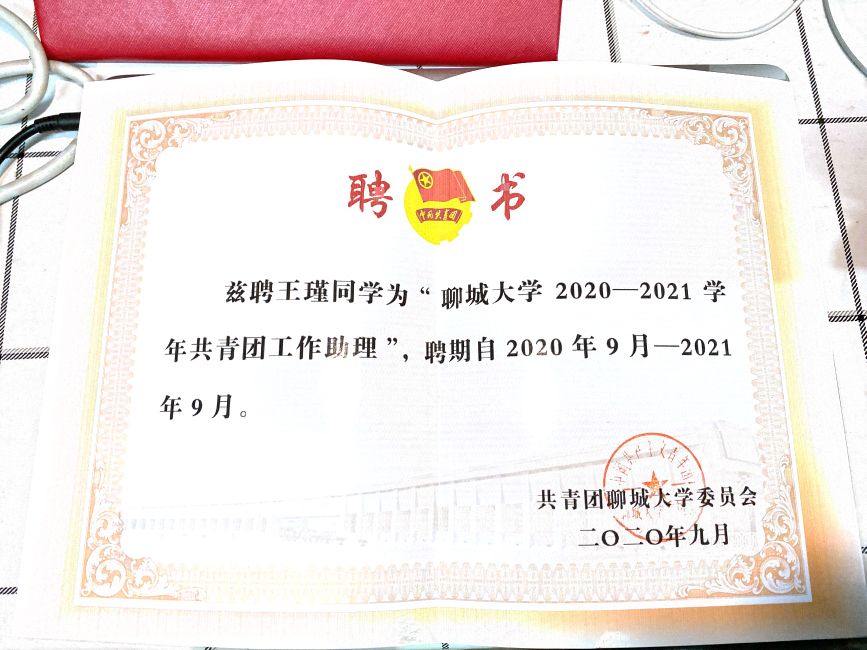 王瑾,“太阳集团2020——2021学年共青团工作助理”