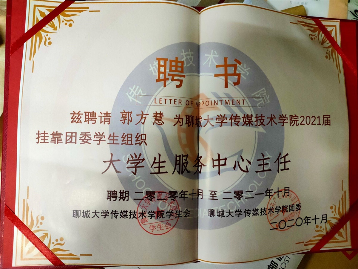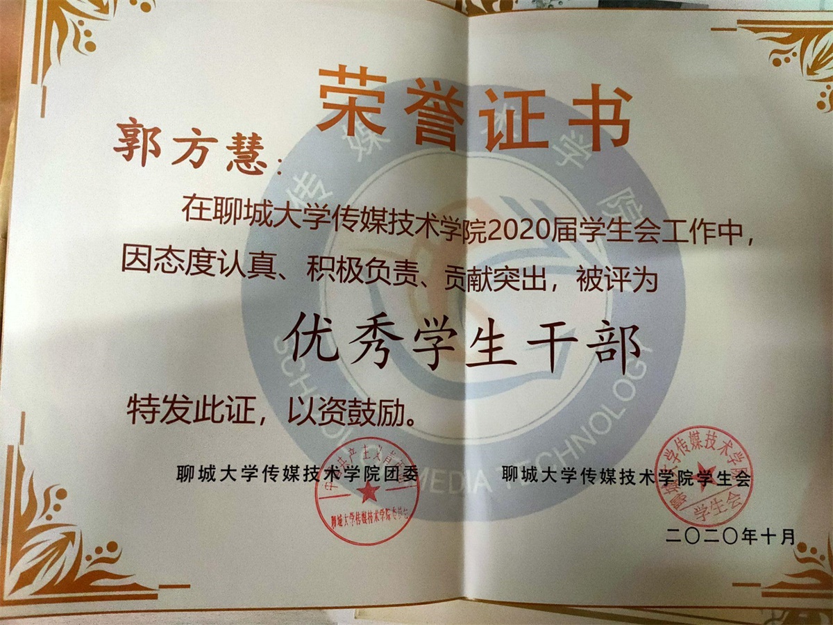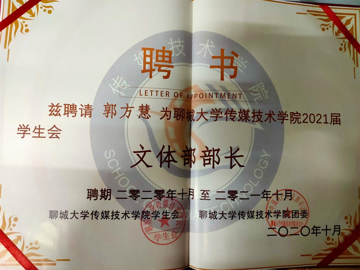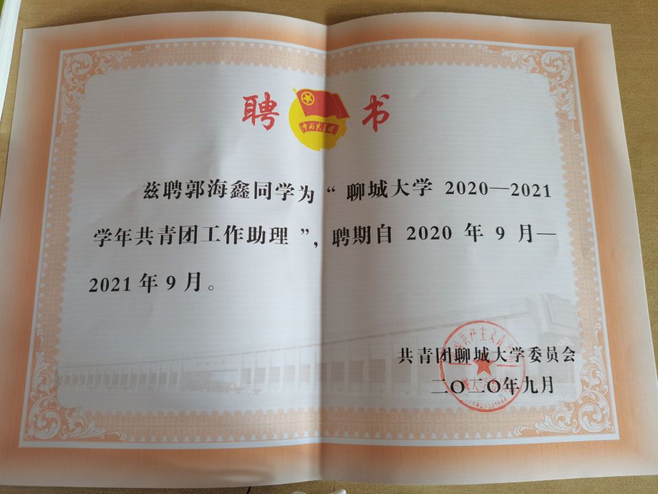 郭海鑫“太阳集团2020——2021学年共青团工作助理”