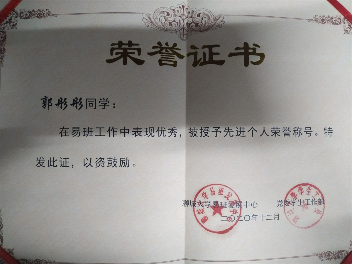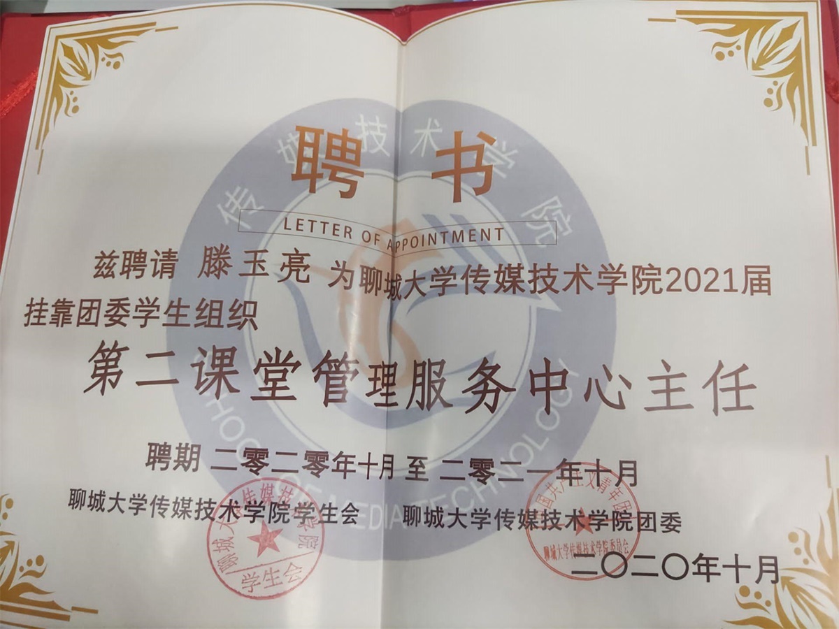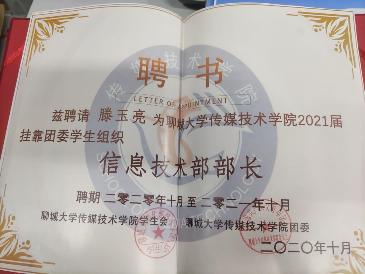 郭海鑫“太阳集团2020——2021学年共青团工作助理”