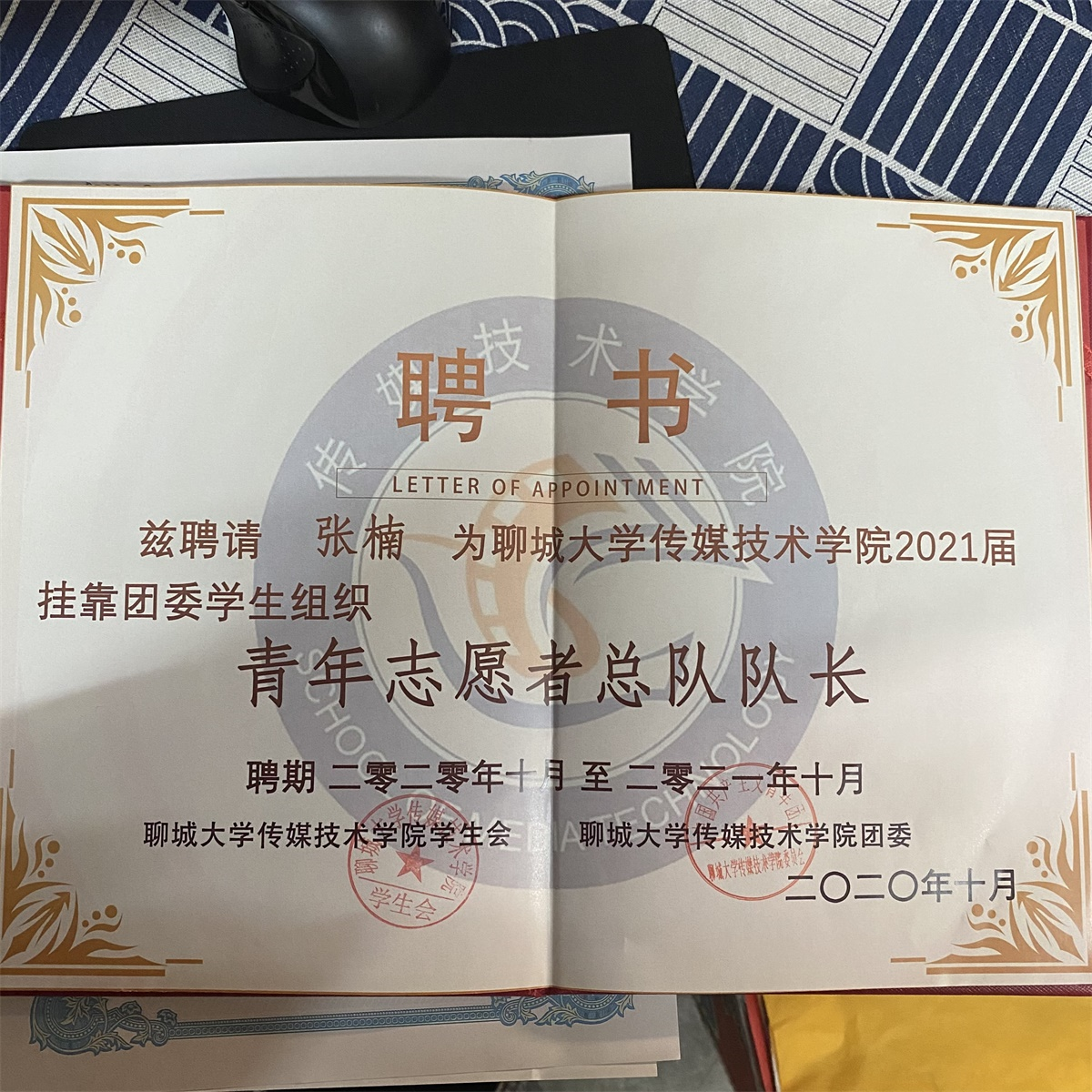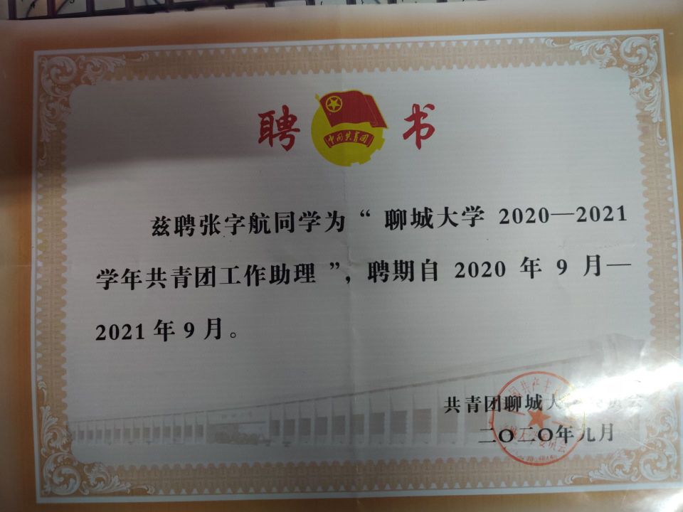 张字航,“太阳集团2020——2021学年共青团工作助理”