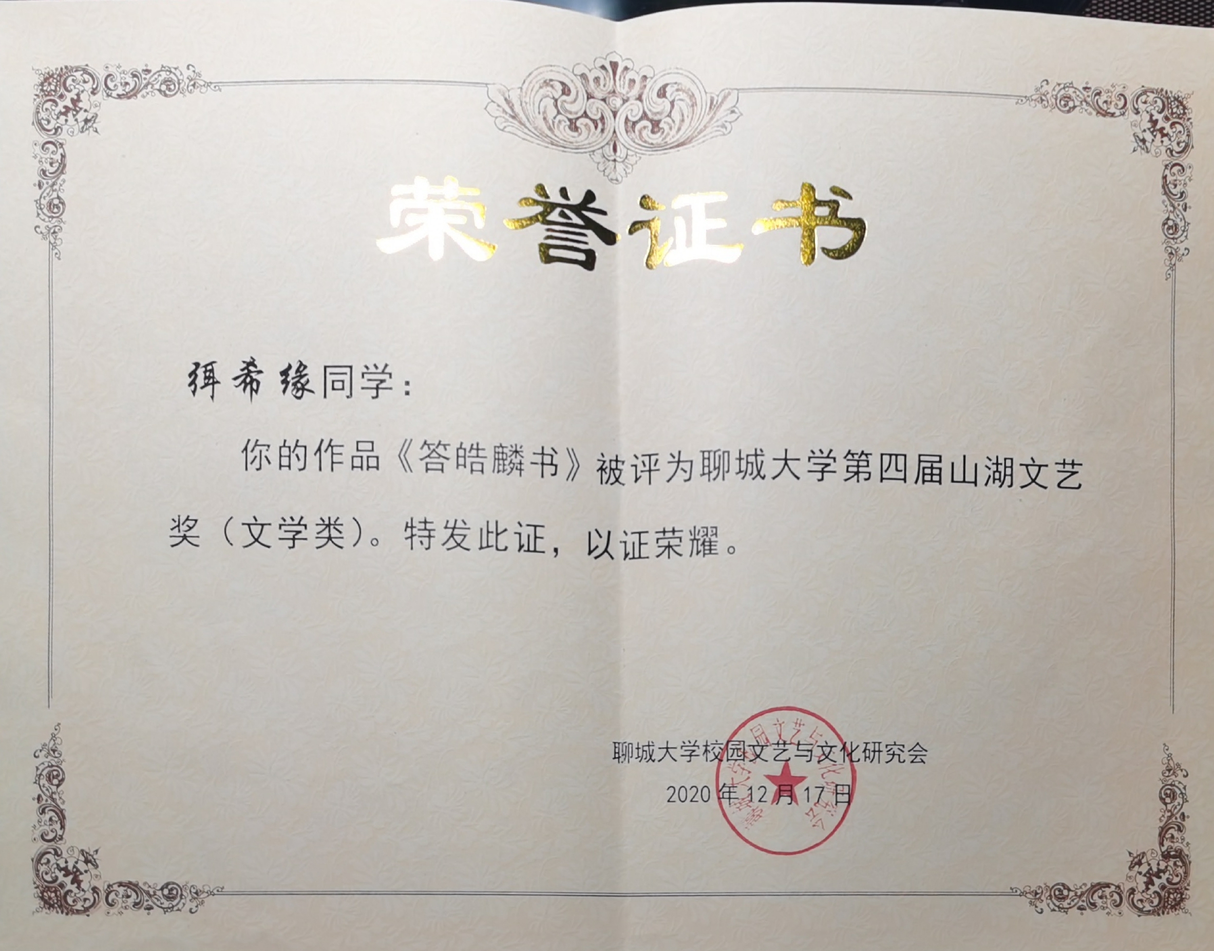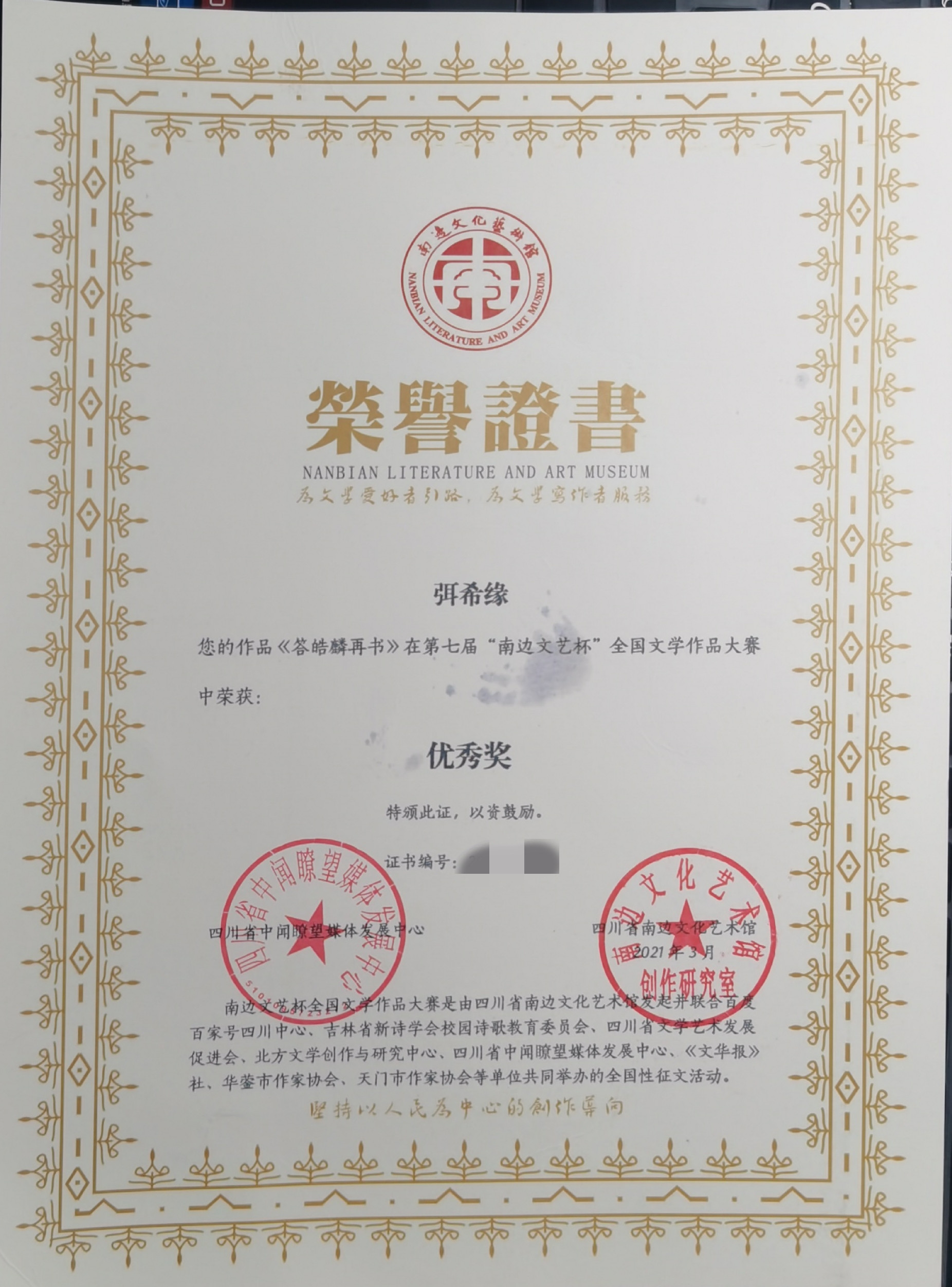 弭希缘,第七届“南边文艺杯”全国文学作品大赛优秀奖
