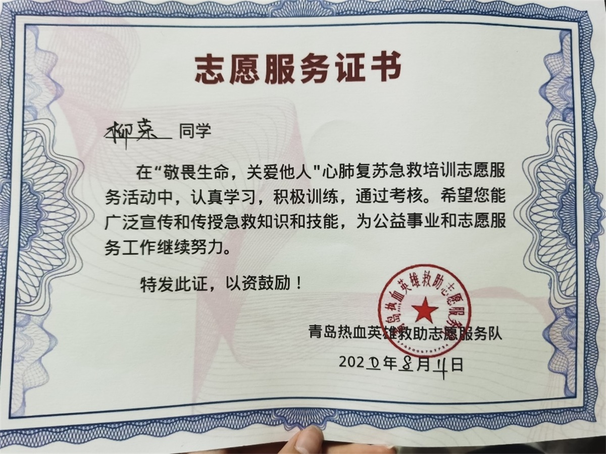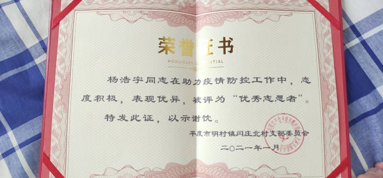 姜家琪获得2020年大学生青年志愿服务工作先进个人