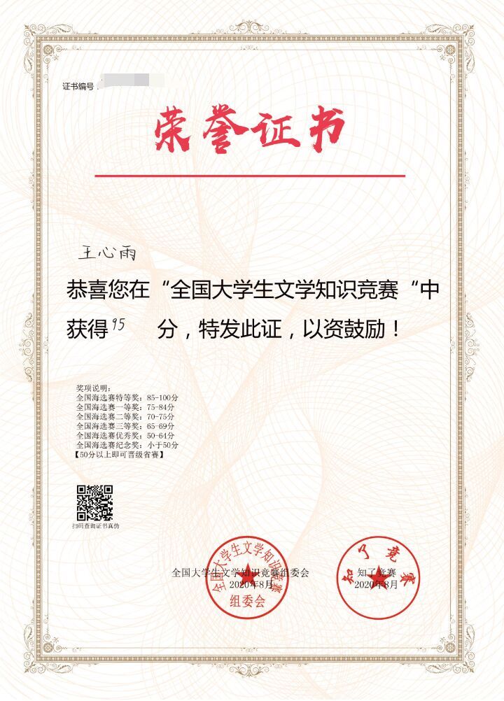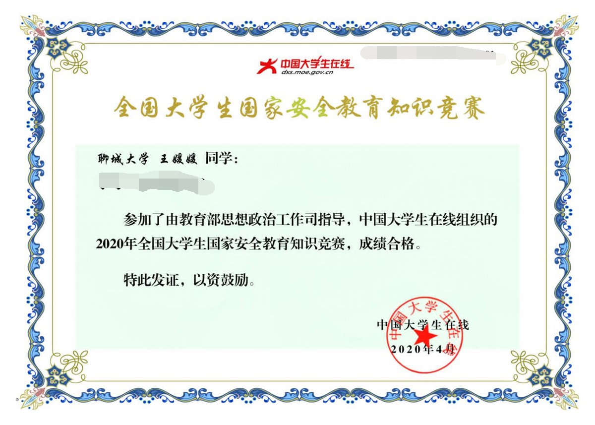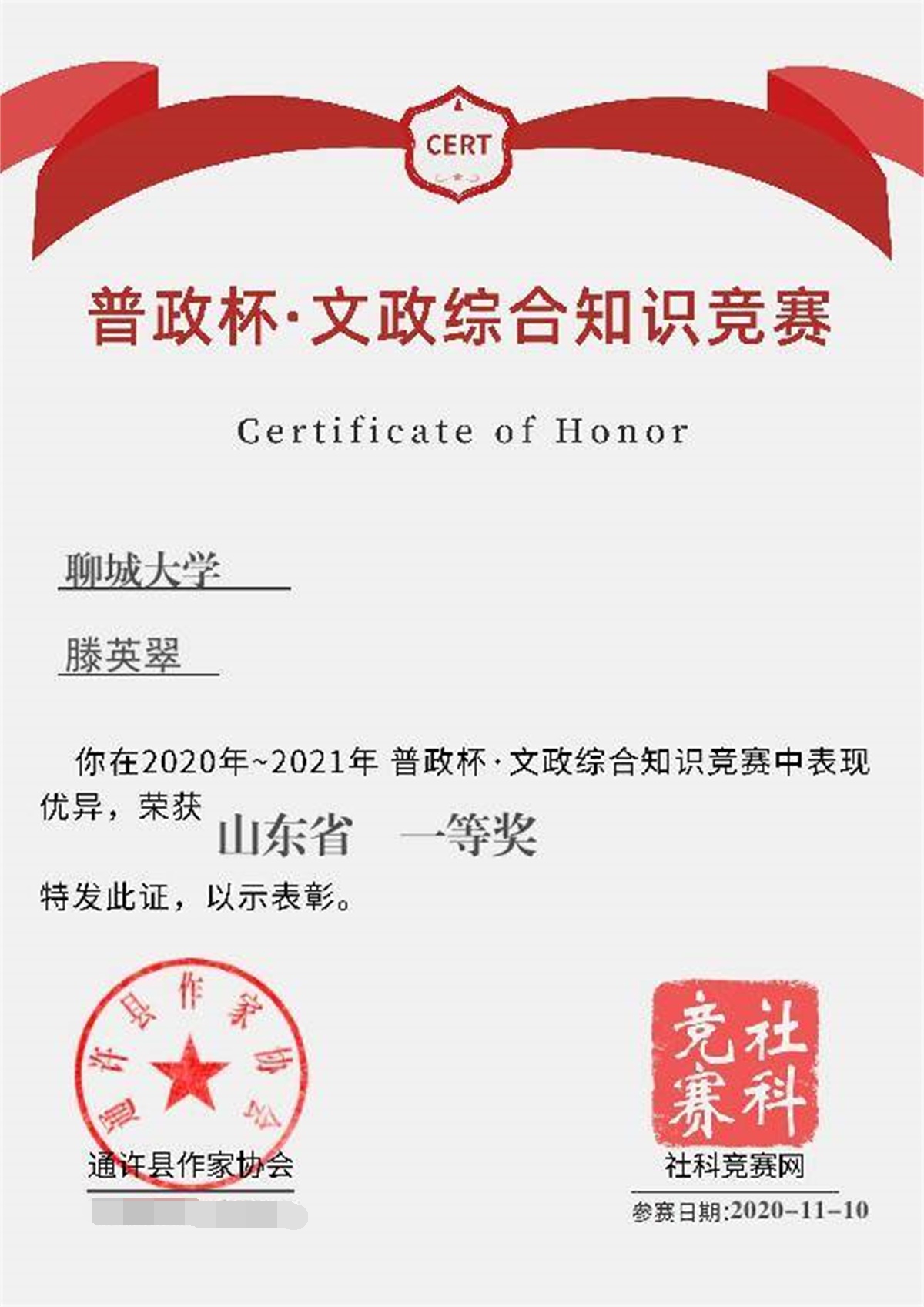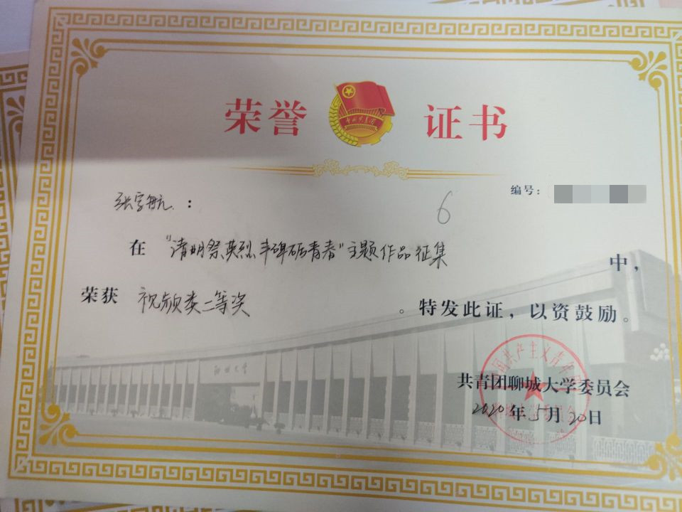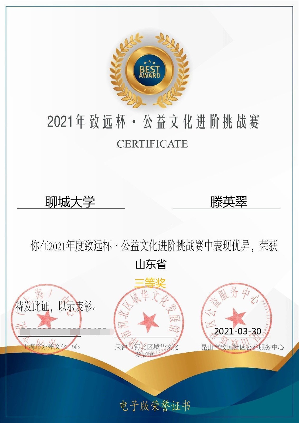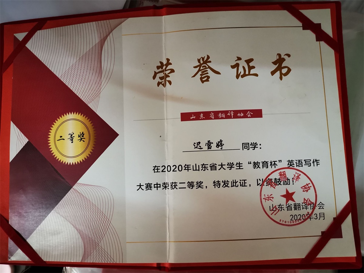 迟雪婷获得.j年山东省大学生“教育杯”英语写作大赛获得二等奖pg