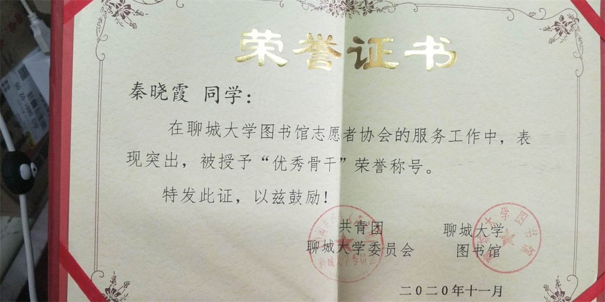 秦晓霞在太阳集团图书馆志愿者协会的服务工作汇总获得“优秀骨干”称号