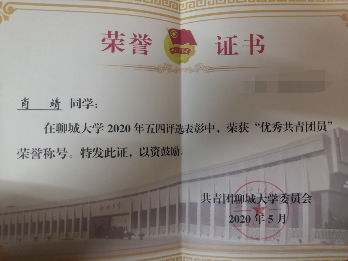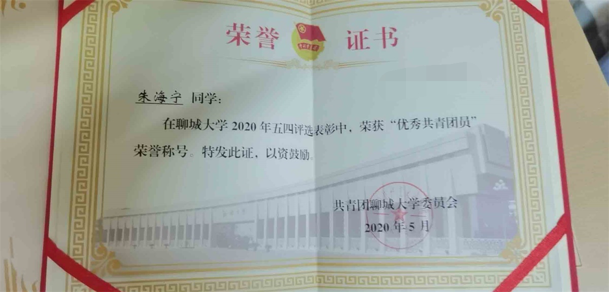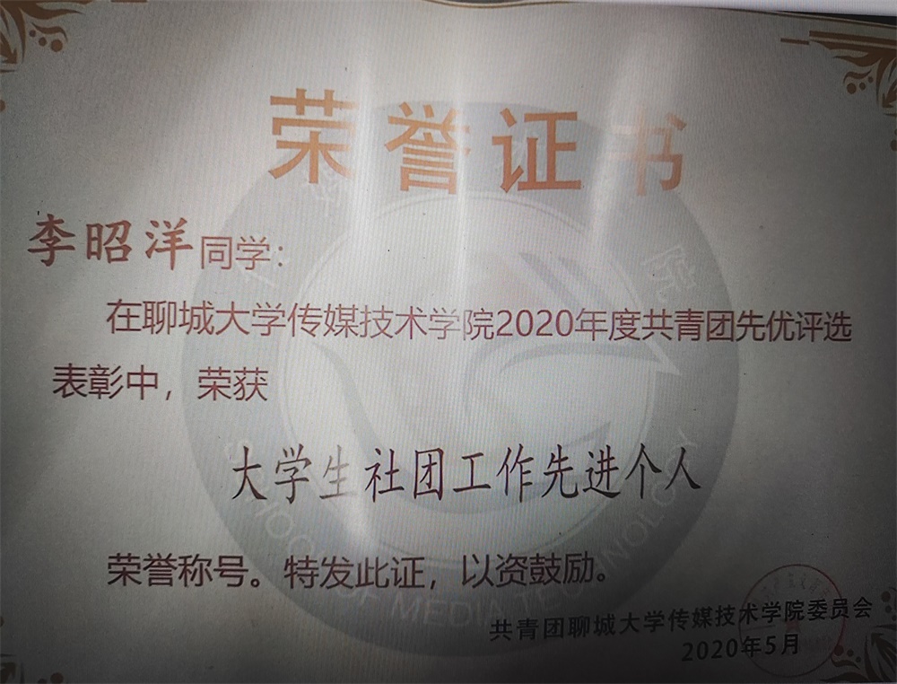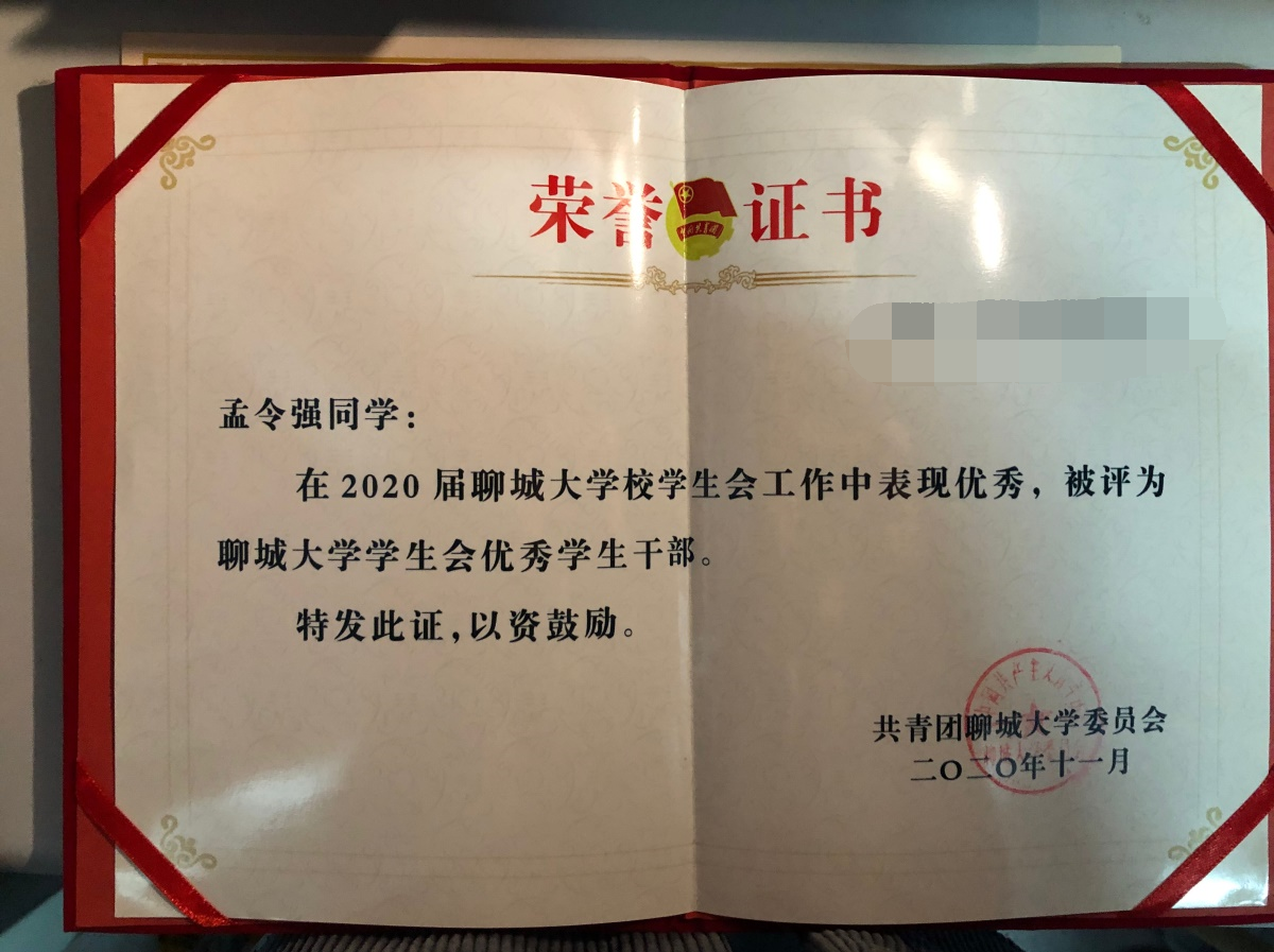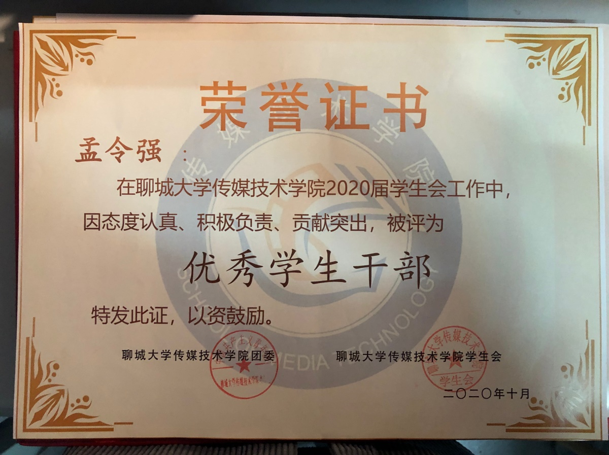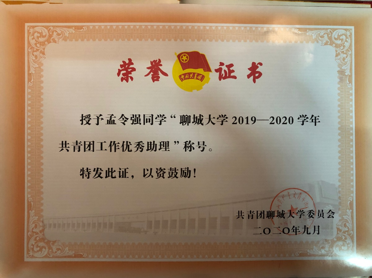 孟令强获得校级“共青团思想引领和宣传教育工作先进个人称号