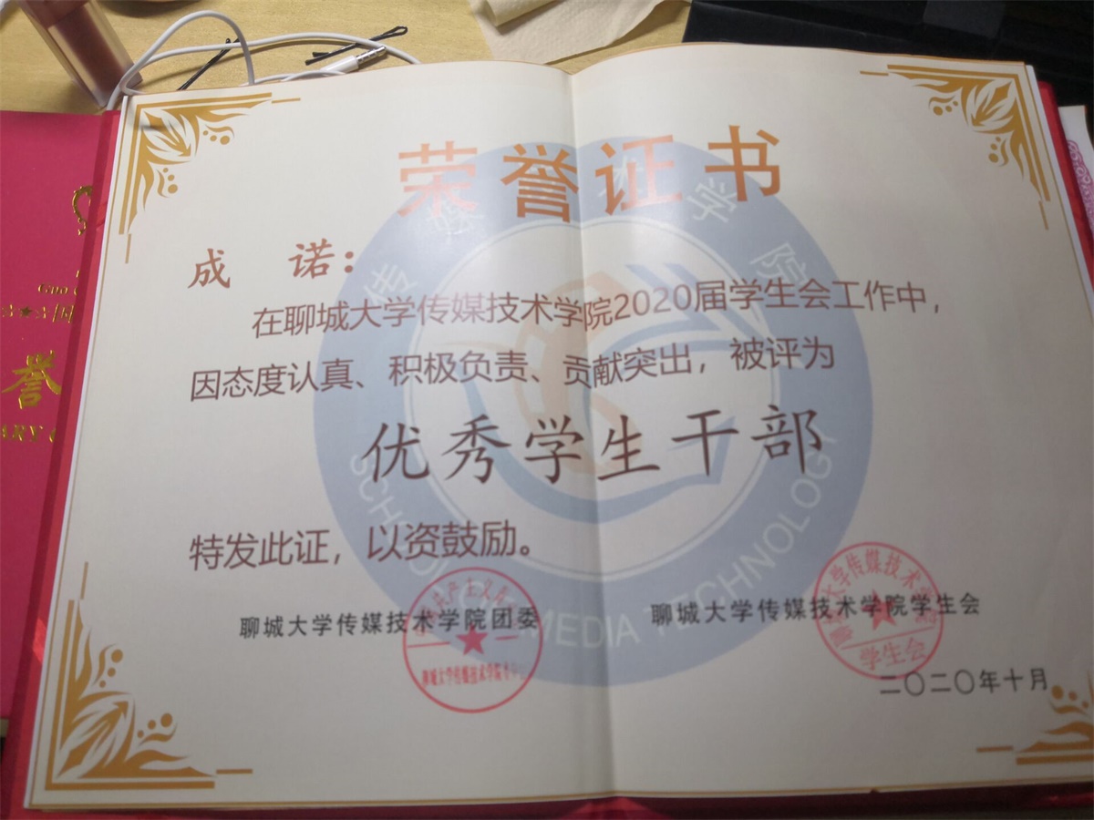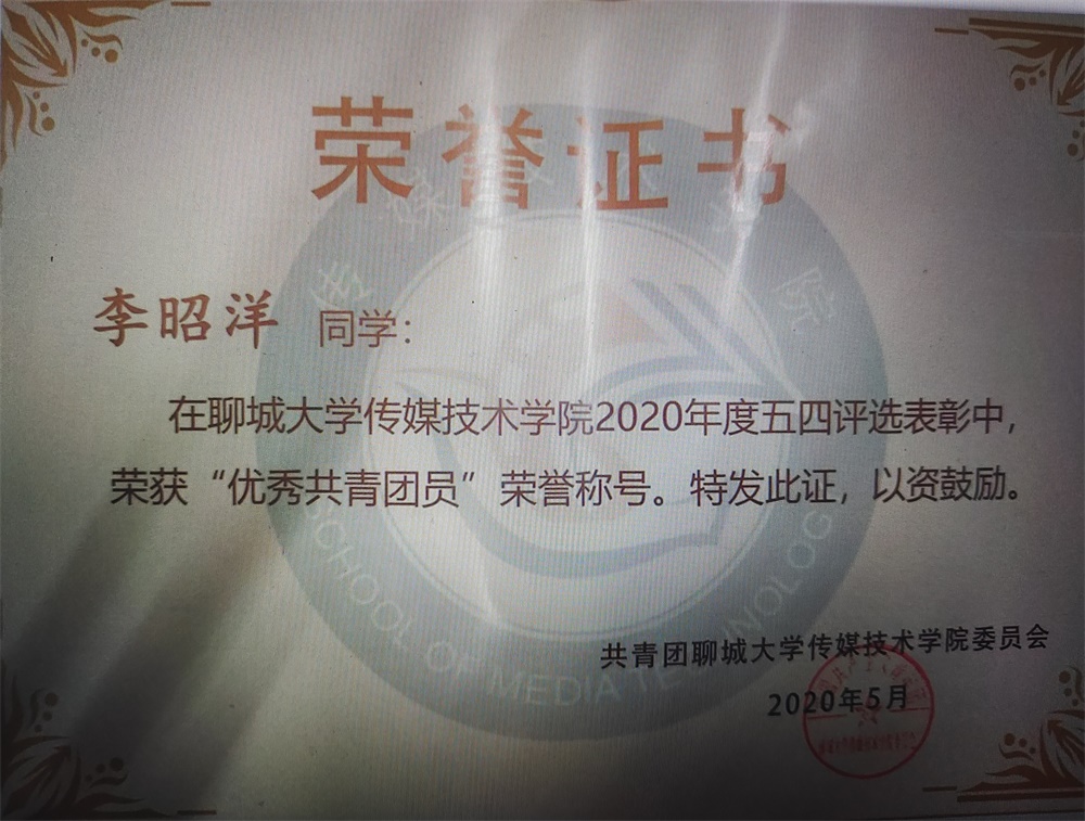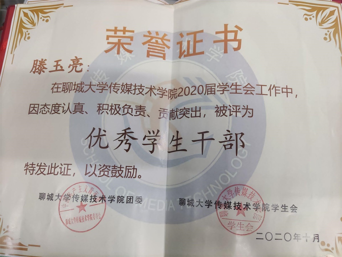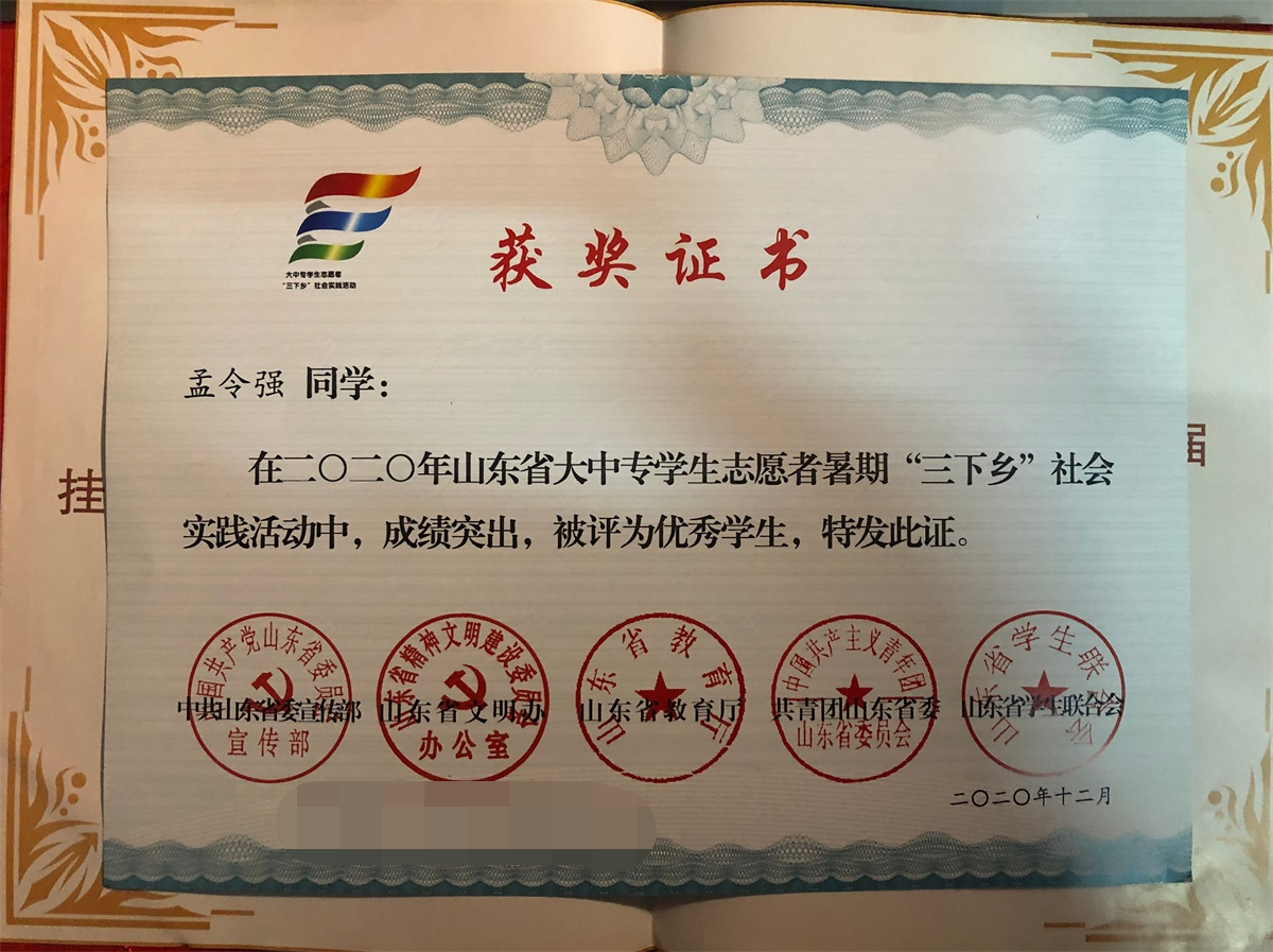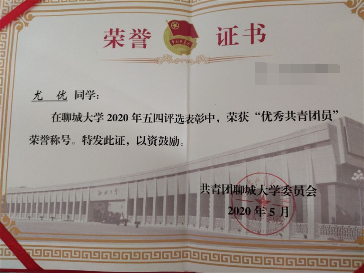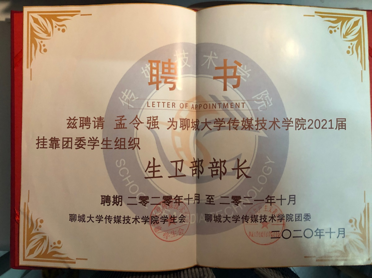 孟令强获得校级“共青团思想引领和宣传教育工作先进个人称号