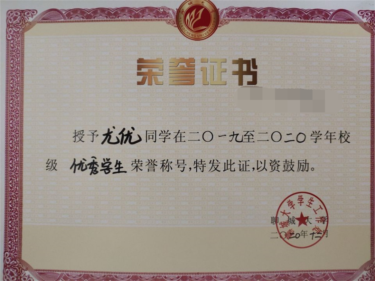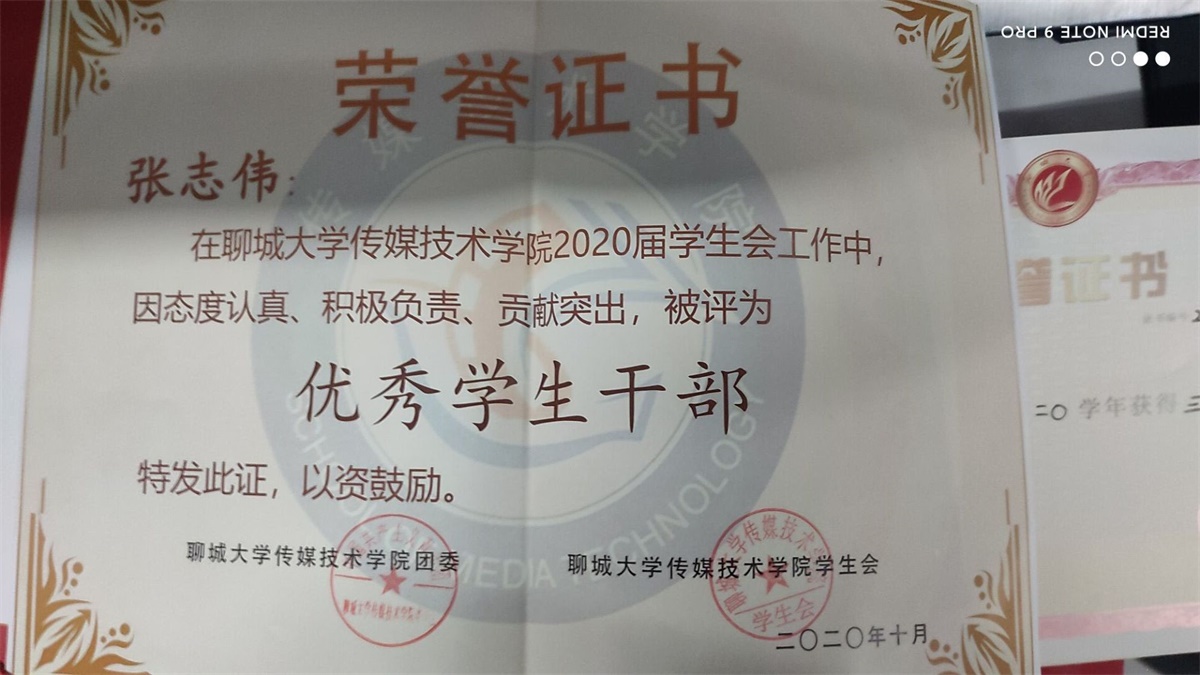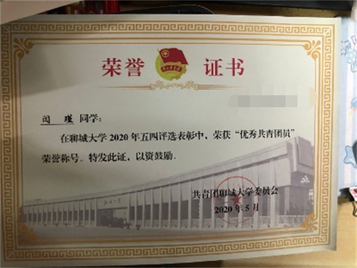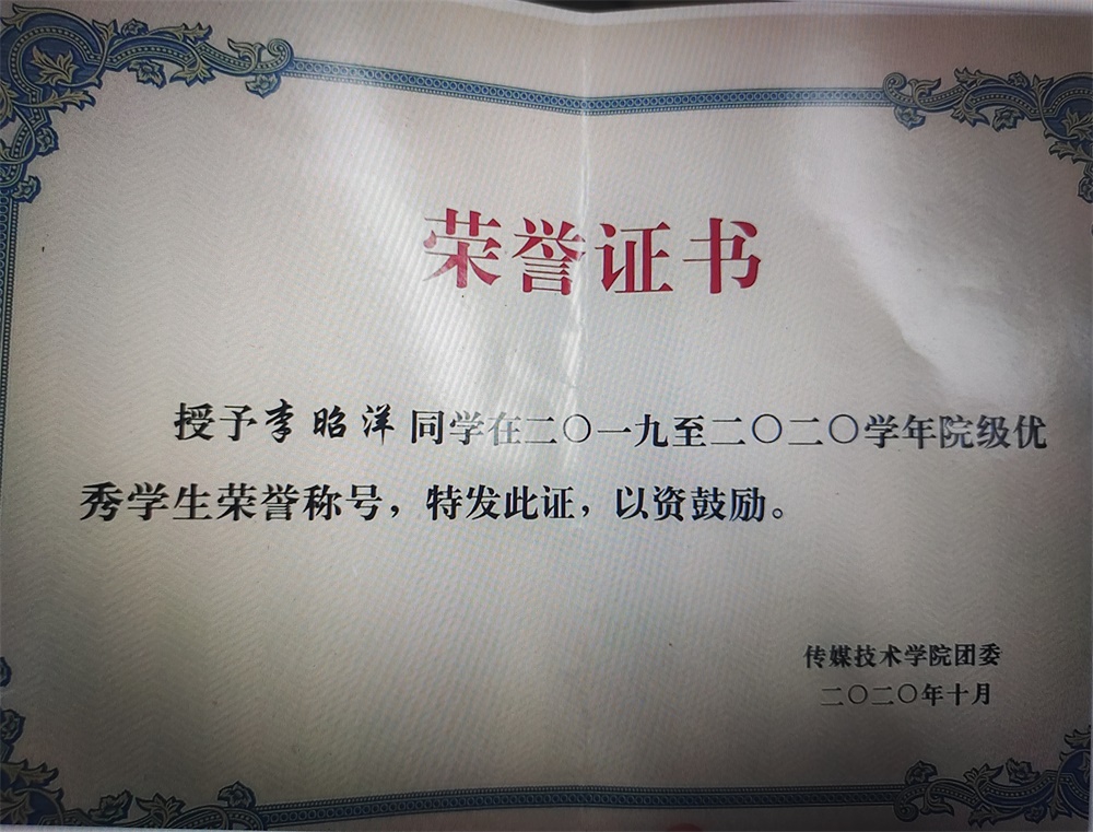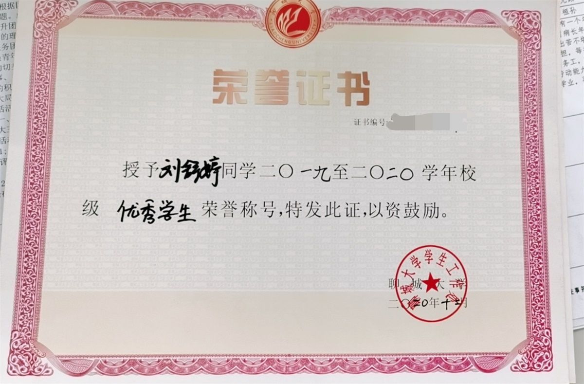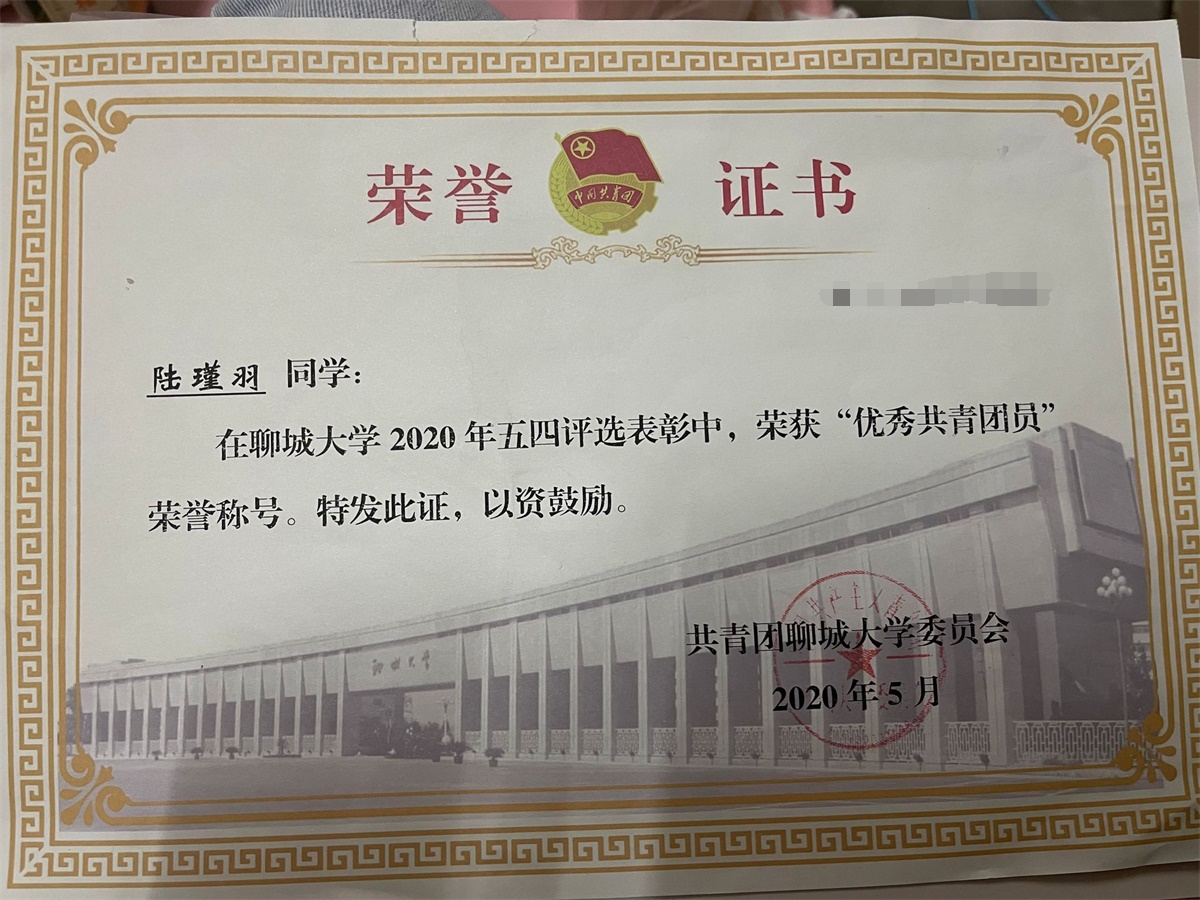 孟令强获得校级“共青团思想引领和宣传教育工作先进个人称号