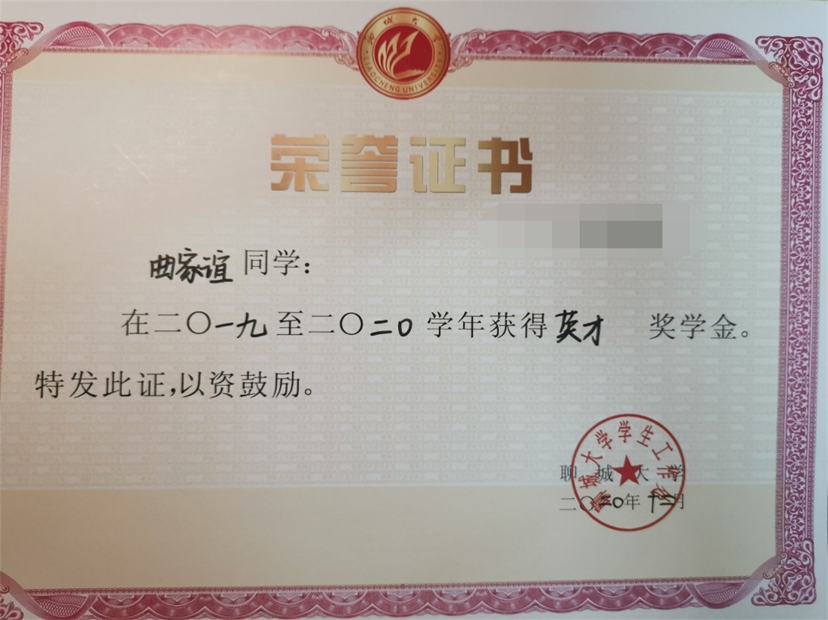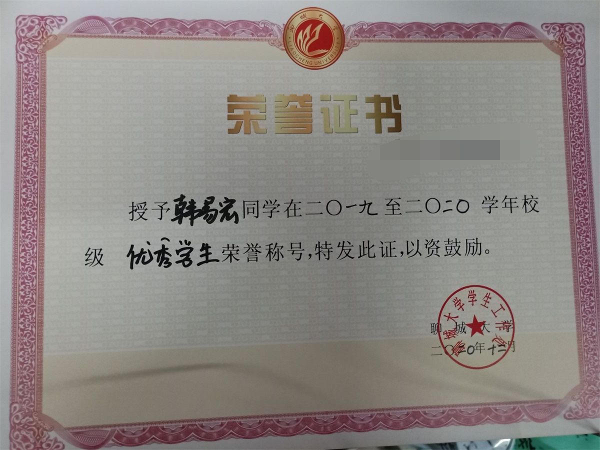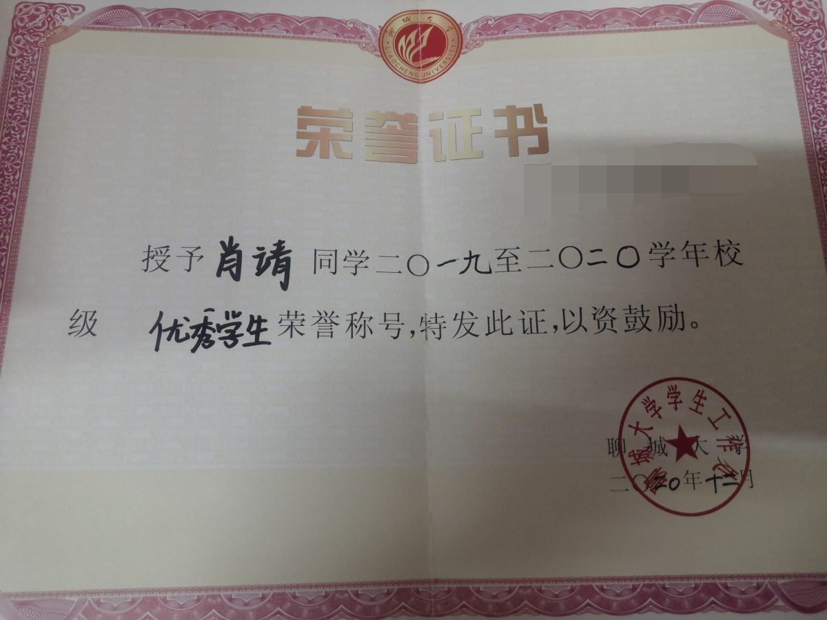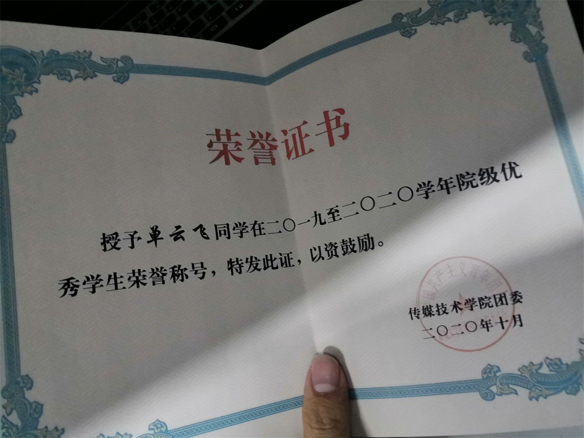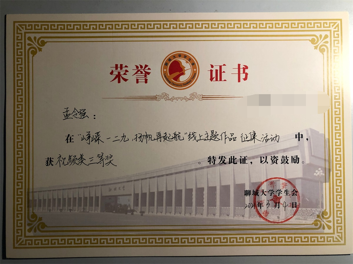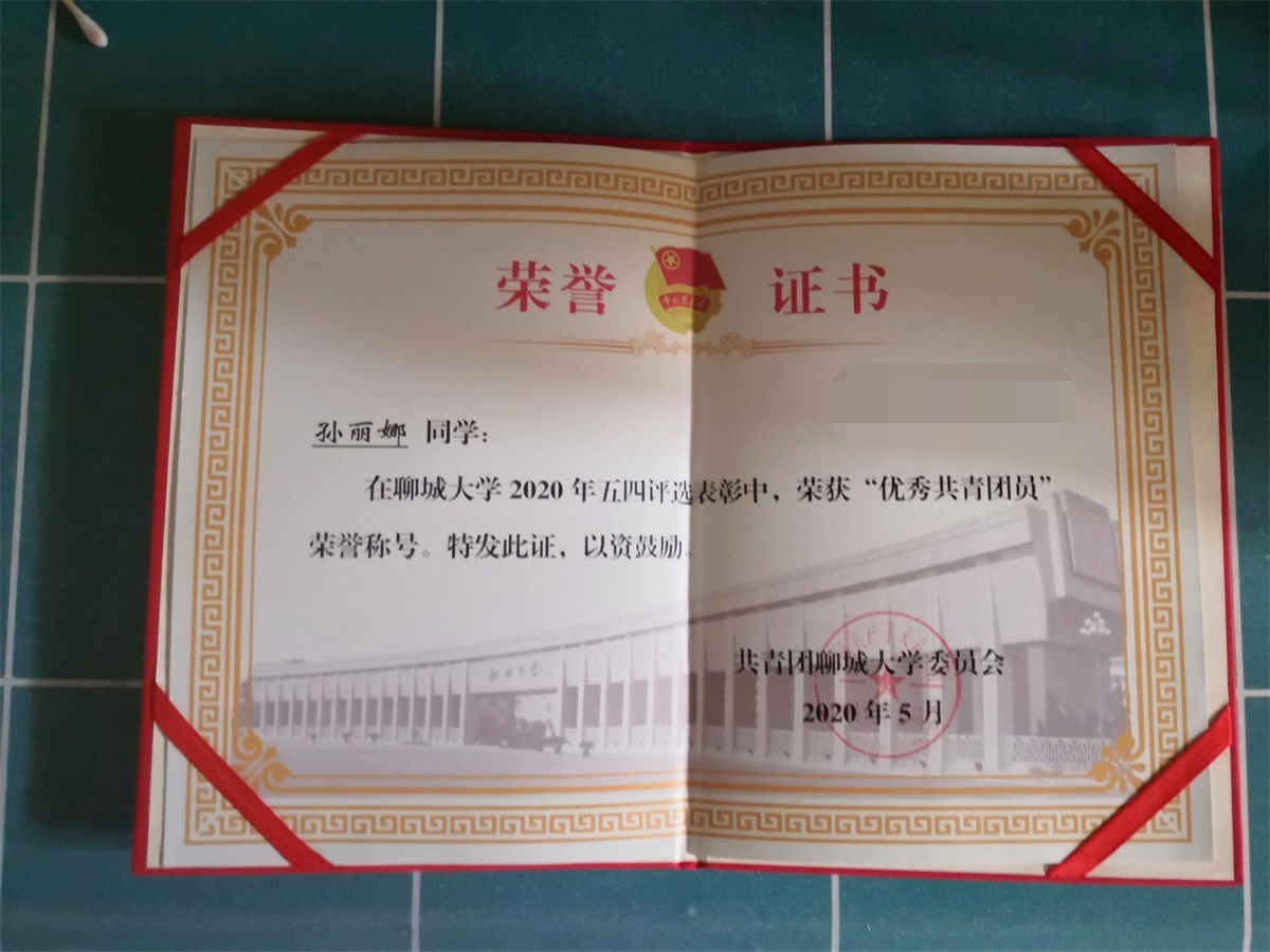 孟令强获得校级“共青团思想引领和宣传教育工作先进个人称号