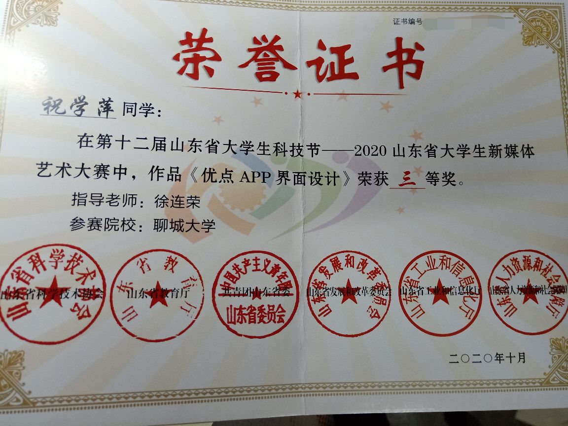 祝学萍扥《优点APP界面设计》获得2020山东省大学生新媒体艺术大赛三等奖