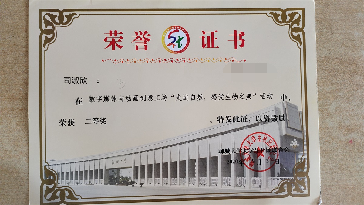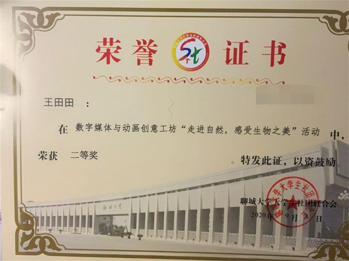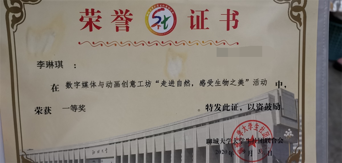 李琳琪在数字媒体与动画创意工坊“走进自然 感受生物之美”活动中获得一等奖