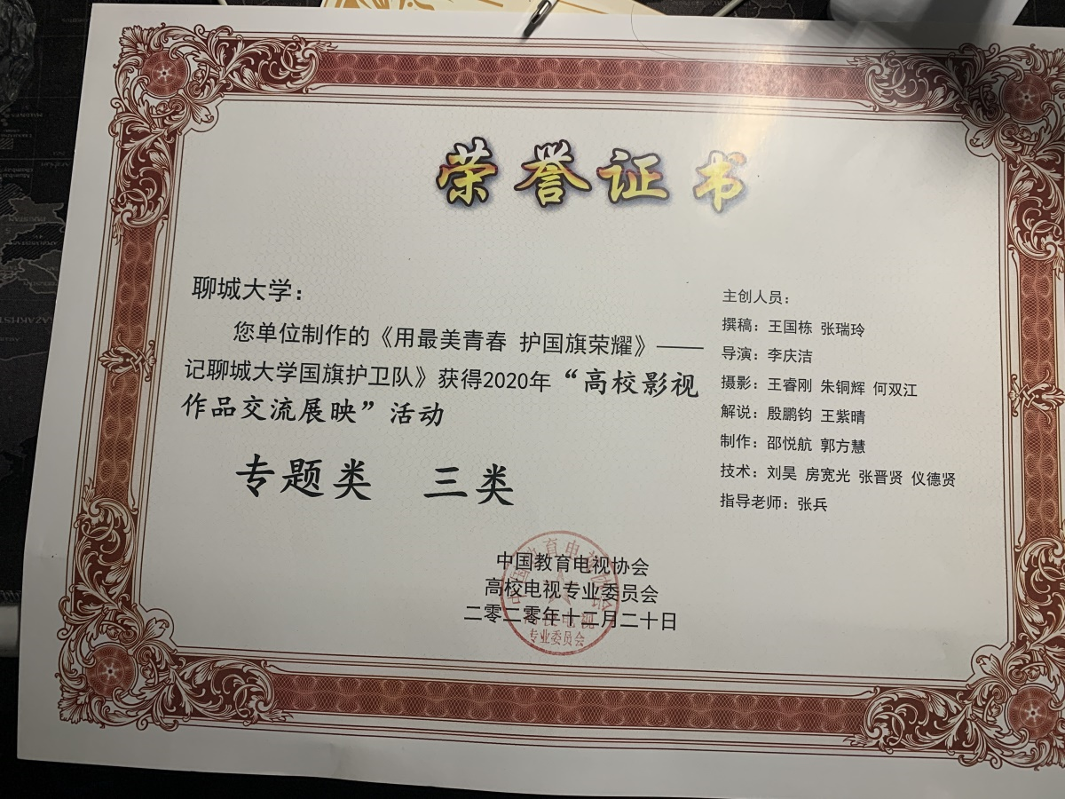 《用最美青春 护国旗荣耀》——《记太阳集团国旗护卫队》获得2020年“高校影视作品交流展映”活动专题类三类