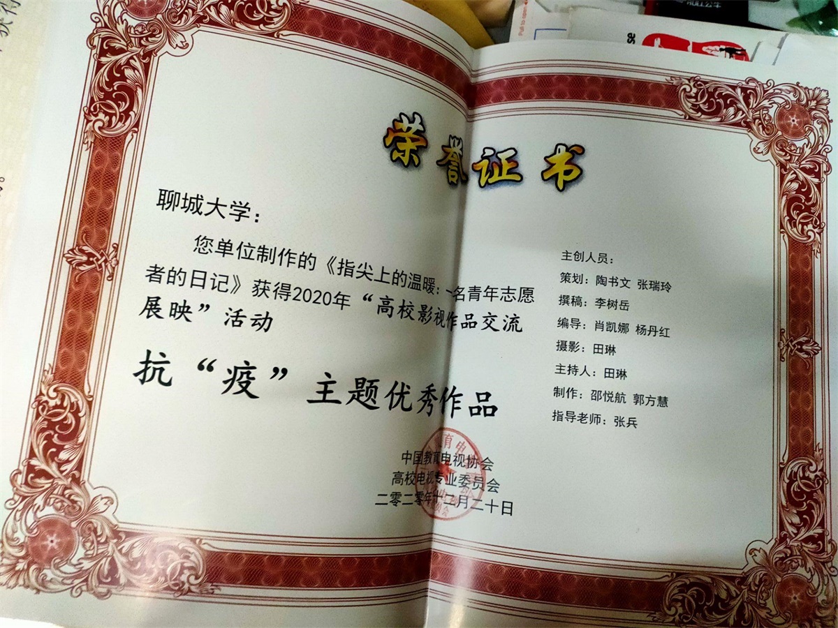 《指尖上的温暖:一名青年志愿者的日记》获得2020年”高校影视作品交流展映“活动抗”疫“主题优秀作品