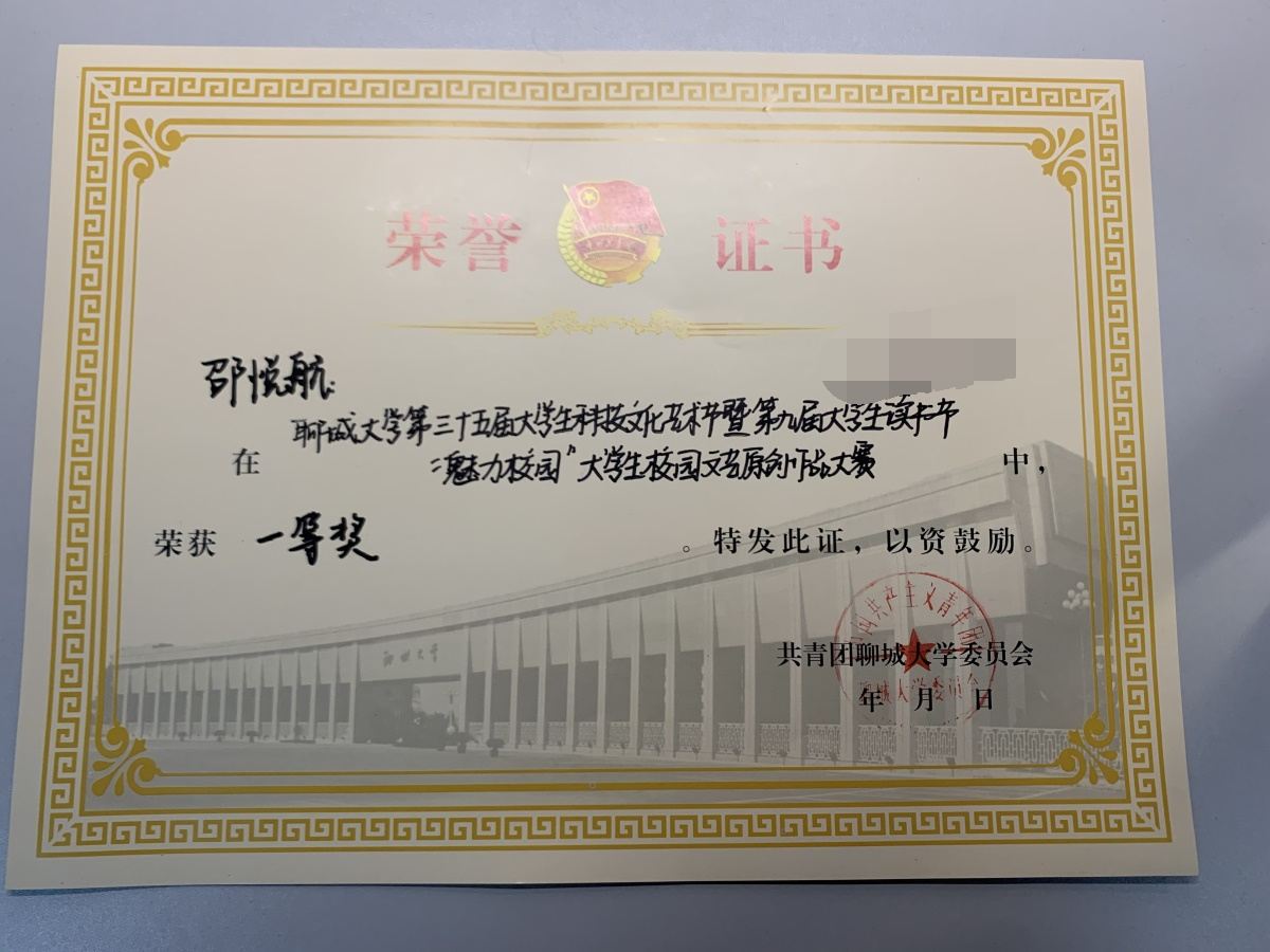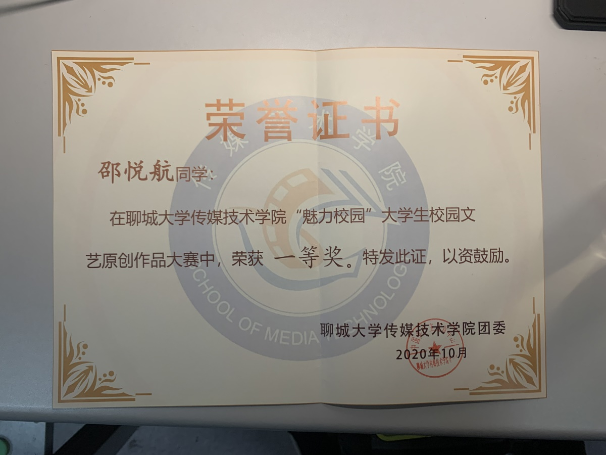 绍悦航获得太阳集团“魅力校园”大学生校园原创作品大赛一等奖