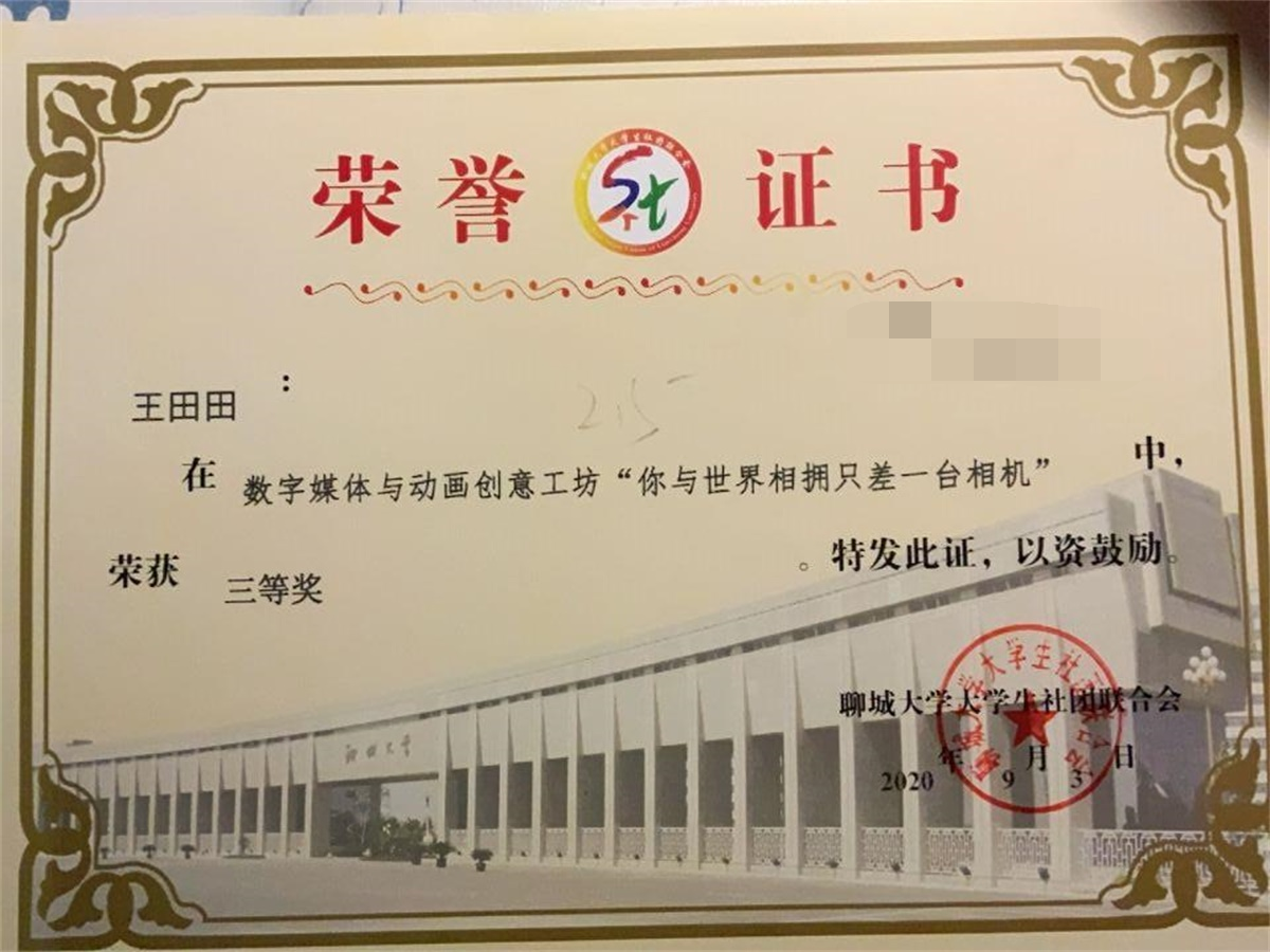 王田田在数字媒体与动画创意工坊”你与世界相拥只差一台相机“获得三等奖