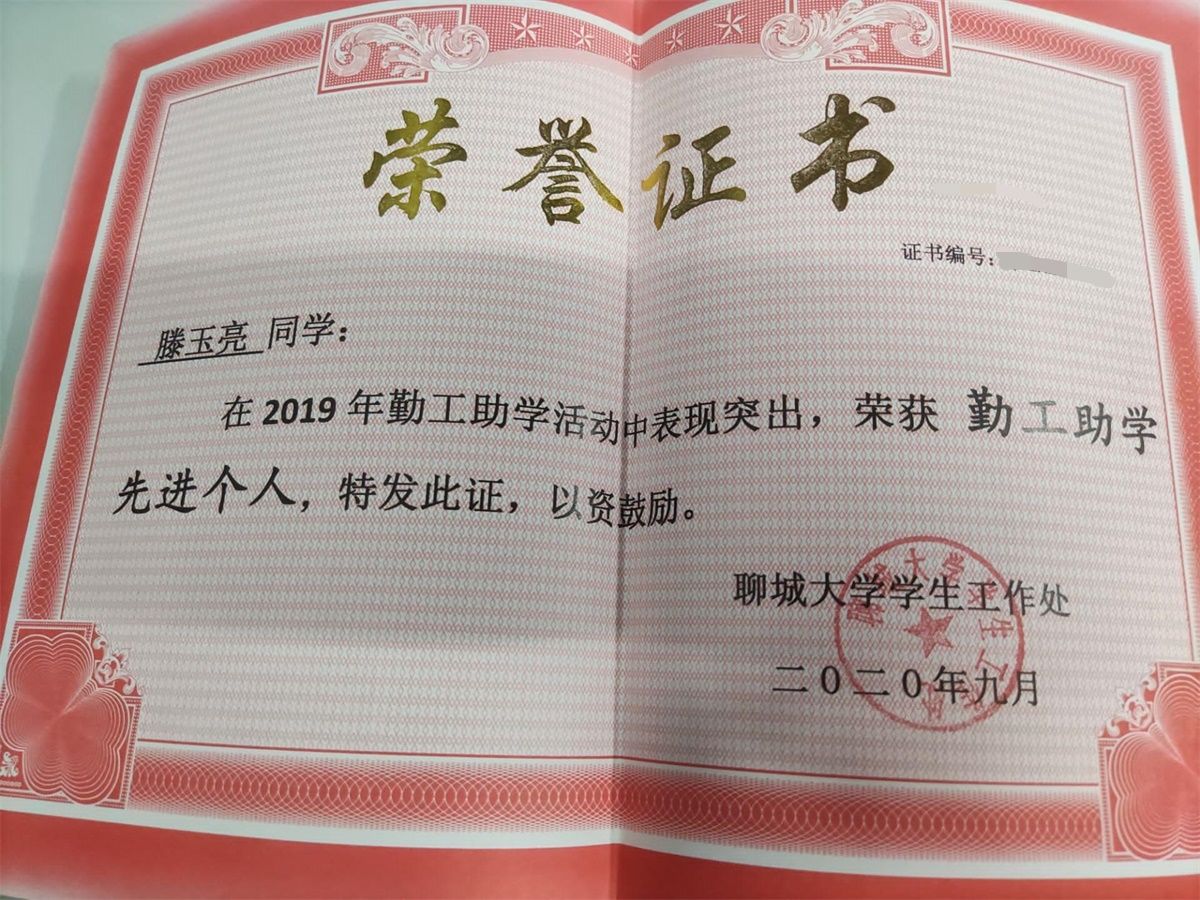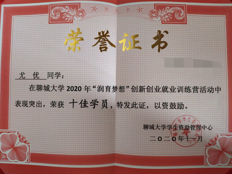 滕玉亮获得2020年“润与梦想”创新创业就业训练荣获优秀工作者