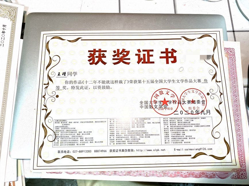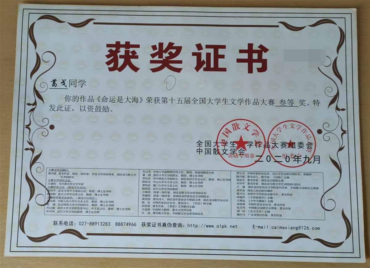 葛戈,2020年第十五届全国大学生文学作品大赛三等奖