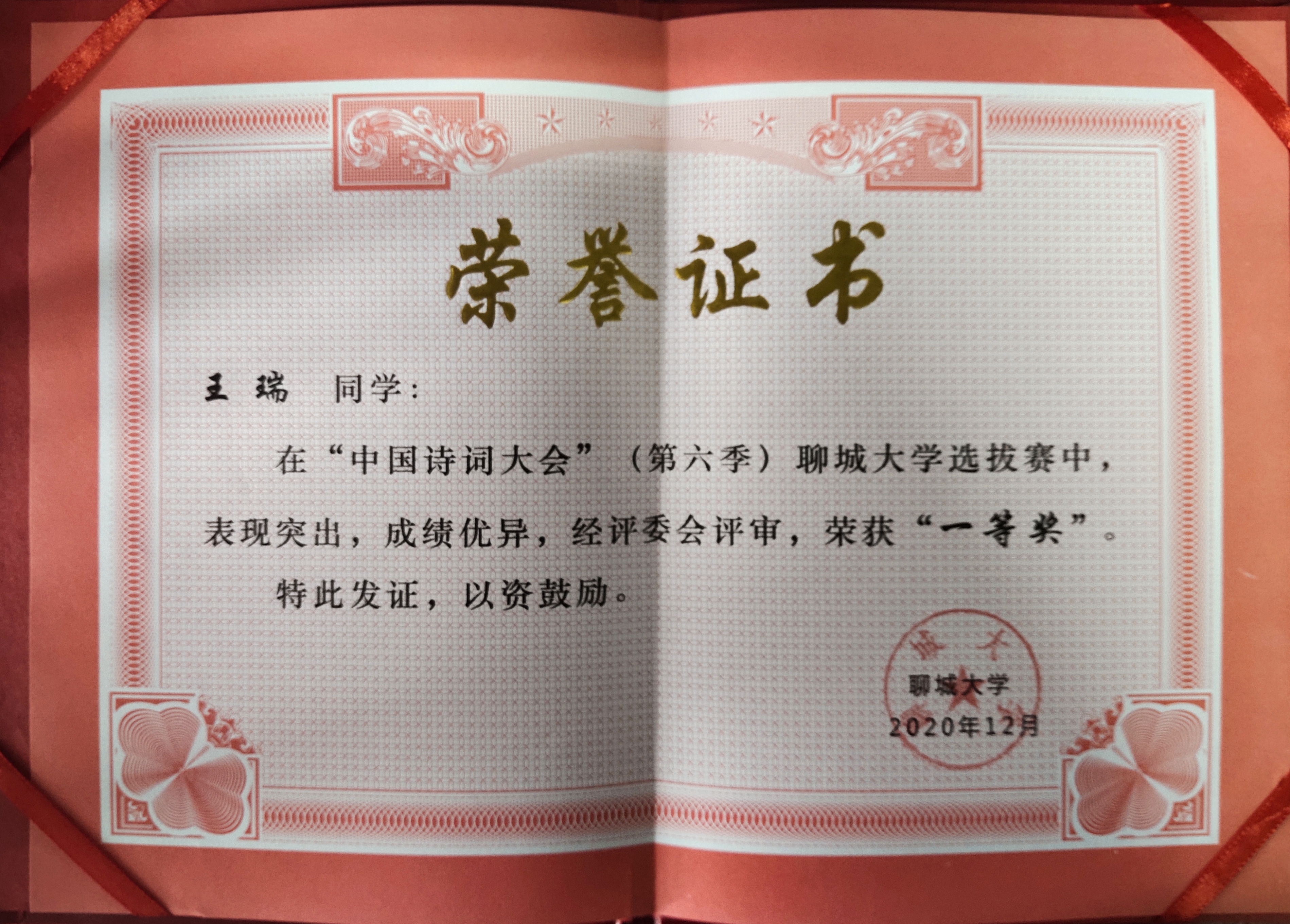 王瑞,“中国诗词大会”第六季太阳集团选拔赛“一等奖”