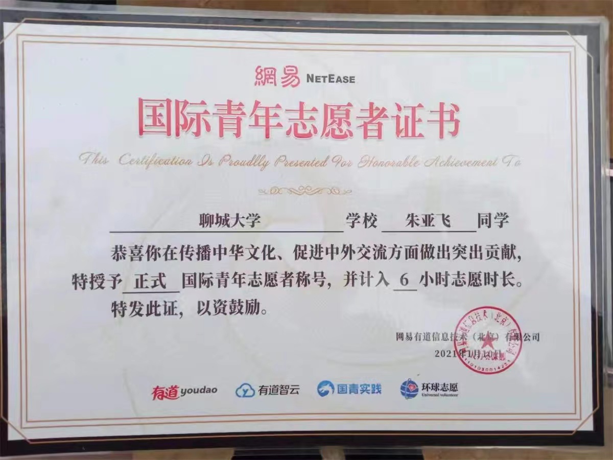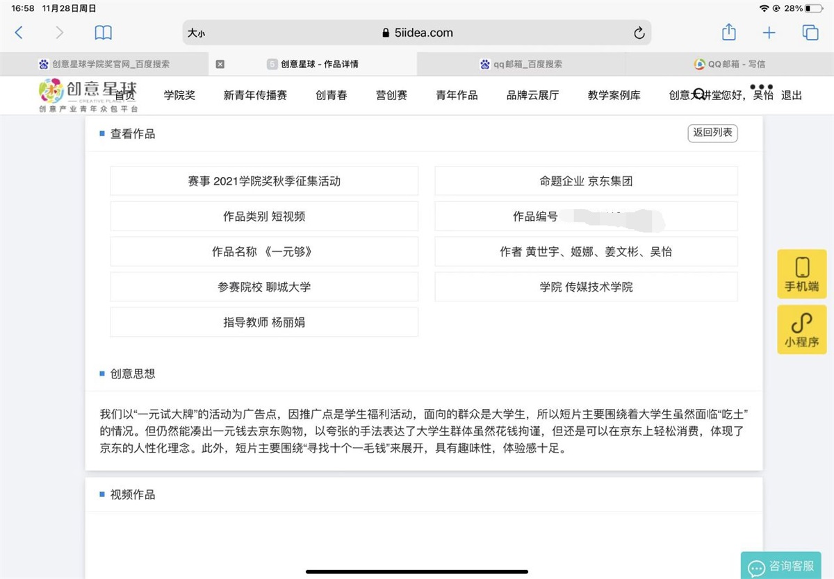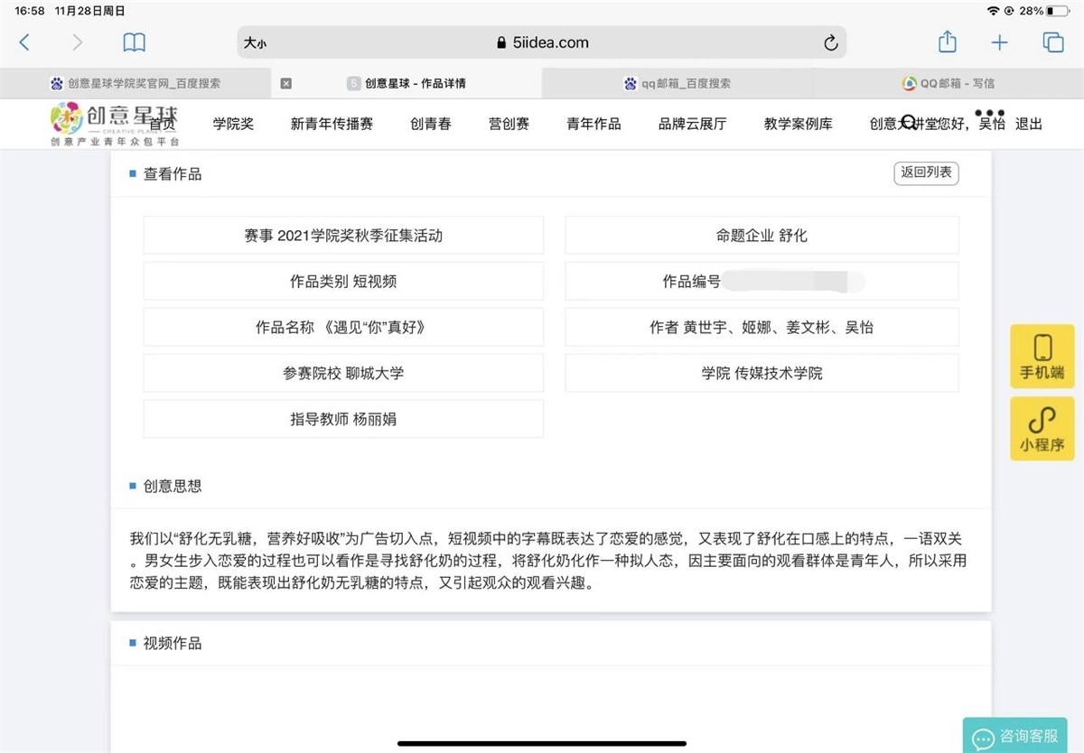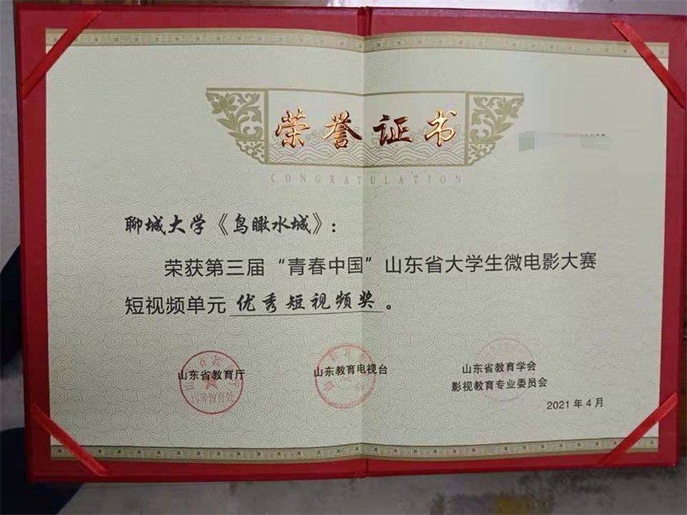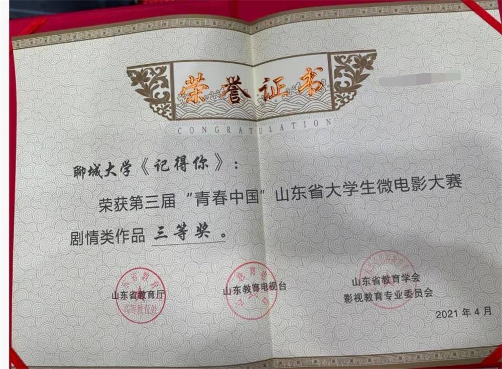李从睿,第三届”青春中国“山东省大学生微电影大赛优秀短视频奖
