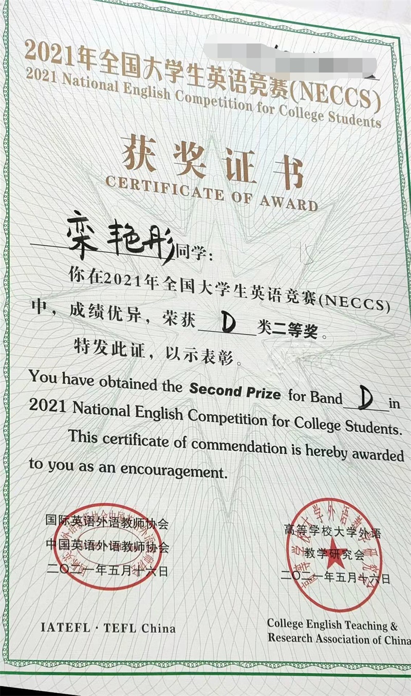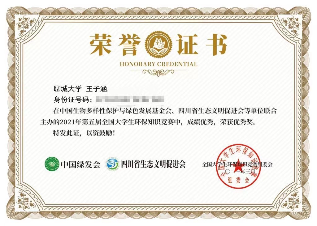 王子涵,2021年第五届全国大学生环保知识竞赛优秀奖