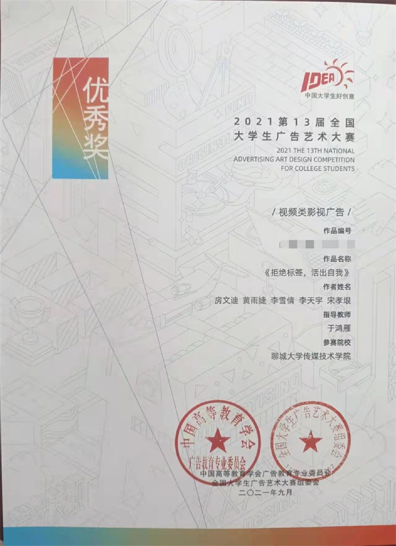 房文迪、黄雨婕、李雪倩、李天宇、宋孝垠,2021第13届大学生广告艺术大赛优秀奖(山东赛区)