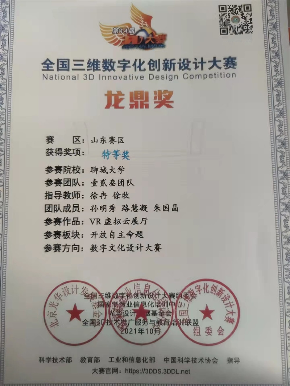 温佳烁、王新灵、路慧凝、王琳,全国三维数字化创新设计大赛一等奖