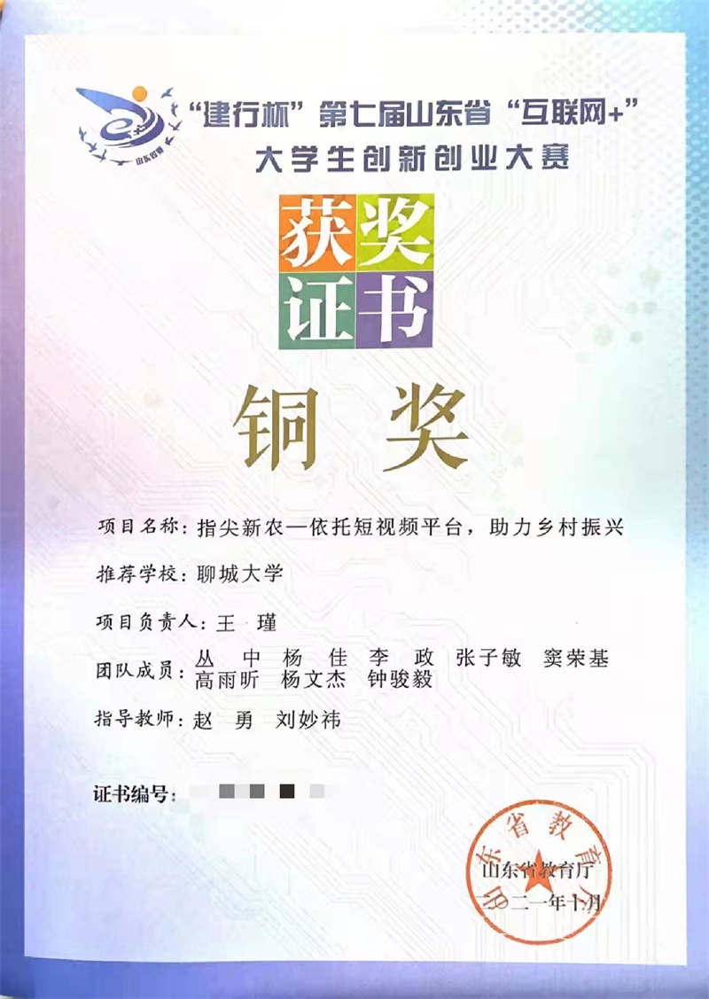 房文迪、董佳乐、齐云彤、张龙姣、李依帆,第七届山东省大学生科技创新大赛二等奖
