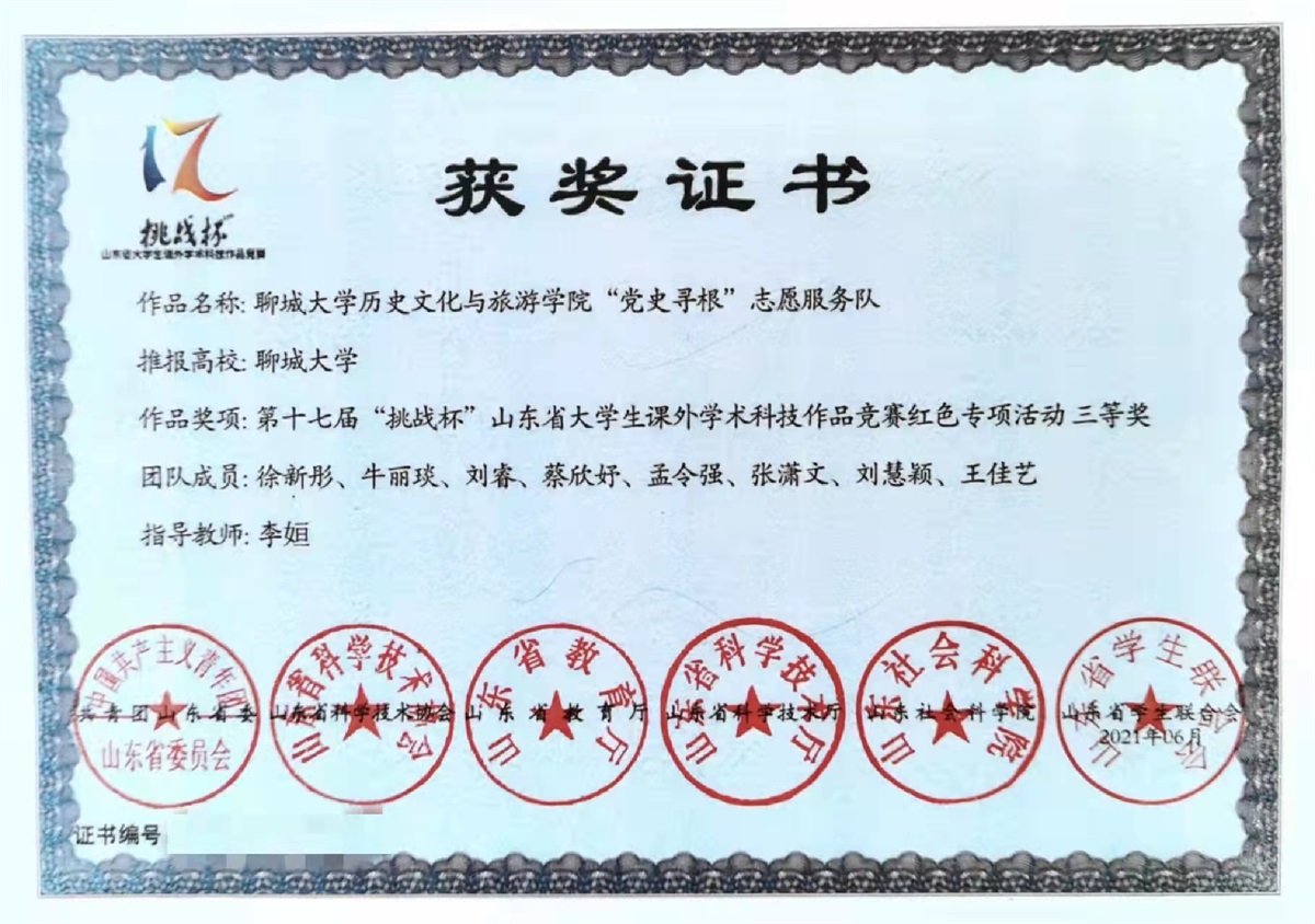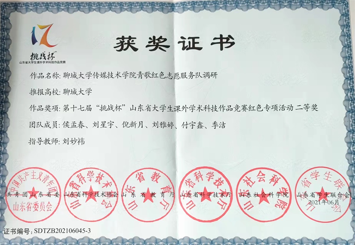 侯孟春、刘星宇、倪新月、刘雅婷、付宇鑫、季洁,第十七届“挑战杯”山东省大学生课外学术科技作品竞赛红色专项活动二等奖