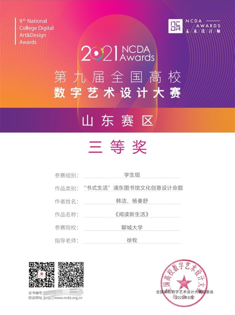 韩洁、杨秦舒,第九届全国高校数字艺术设计大赛三等奖