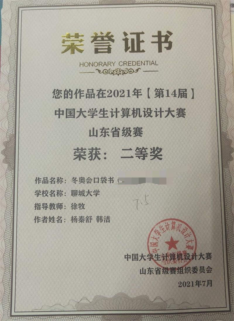 杨秦舒、韩洁,第14届中国大学生计算机设计大赛二等奖