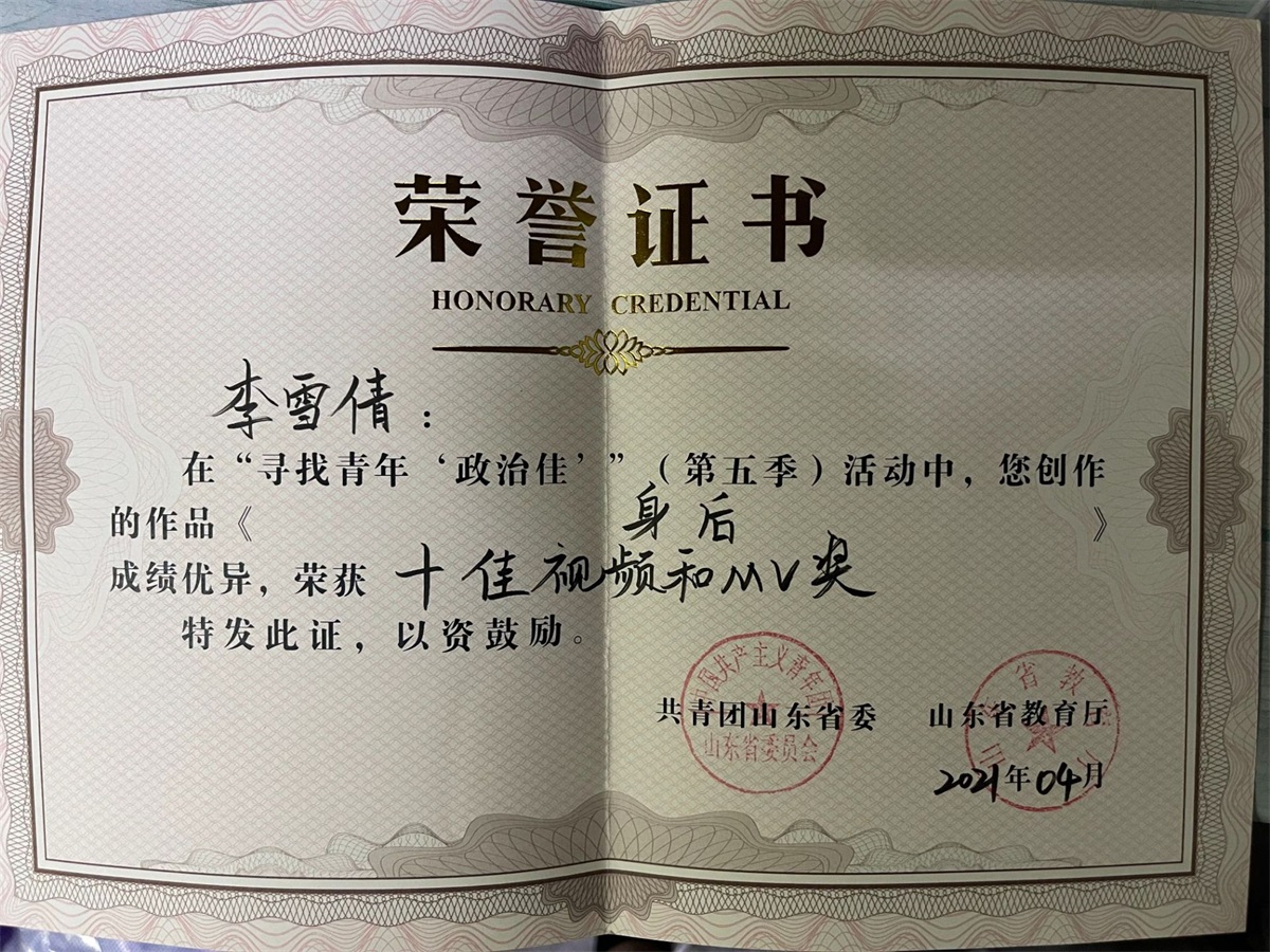 刘丽霞,山东省寻找青年“政治佳”活动十佳视频和MV奖