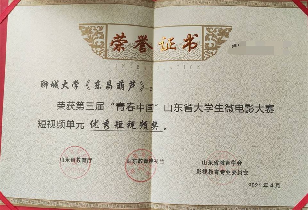 李从睿,第三届”青春中国“山东省大学生微电影大赛最佳短视频奖
