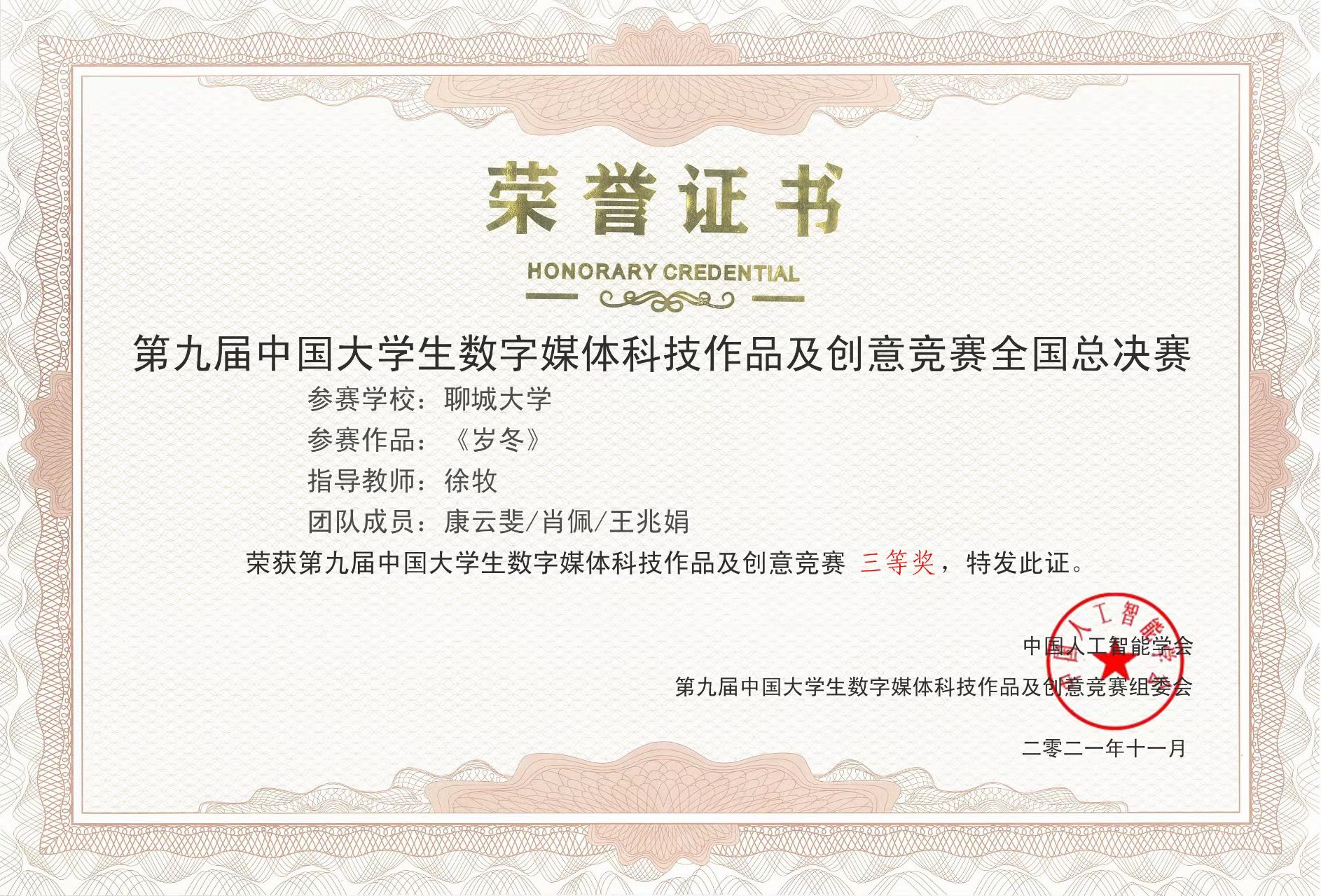 康云斐、肖佩、王兆娟,第九届中国大学生数字媒体科技作品及创意竞赛全国总决赛三等奖