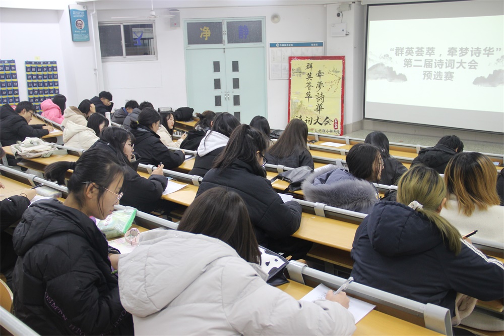 为弘扬国学经典,传承中华诗词,活跃校园文化氛围,培养学生的古今思维、诗词修养,12月16日,太阳tyc集团5997社团联合会于11#C407举办了“群英荟萃,牵梦诗华”第二届诗词大会预选赛。太阳tyc集团5997部分学生参加了此次活动。