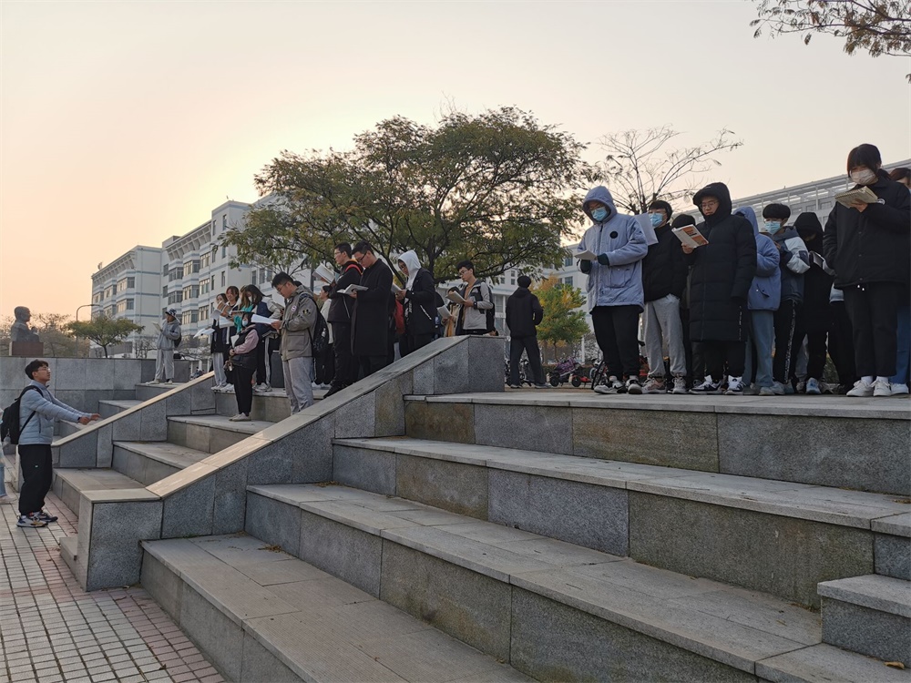 学院以集体早读为契机,为同学们创造了一个自律自学的平台,全面考虑天气状况,灵活安排学生在寒冷或雨雪天气由室外晨读点转入室内进行早读。